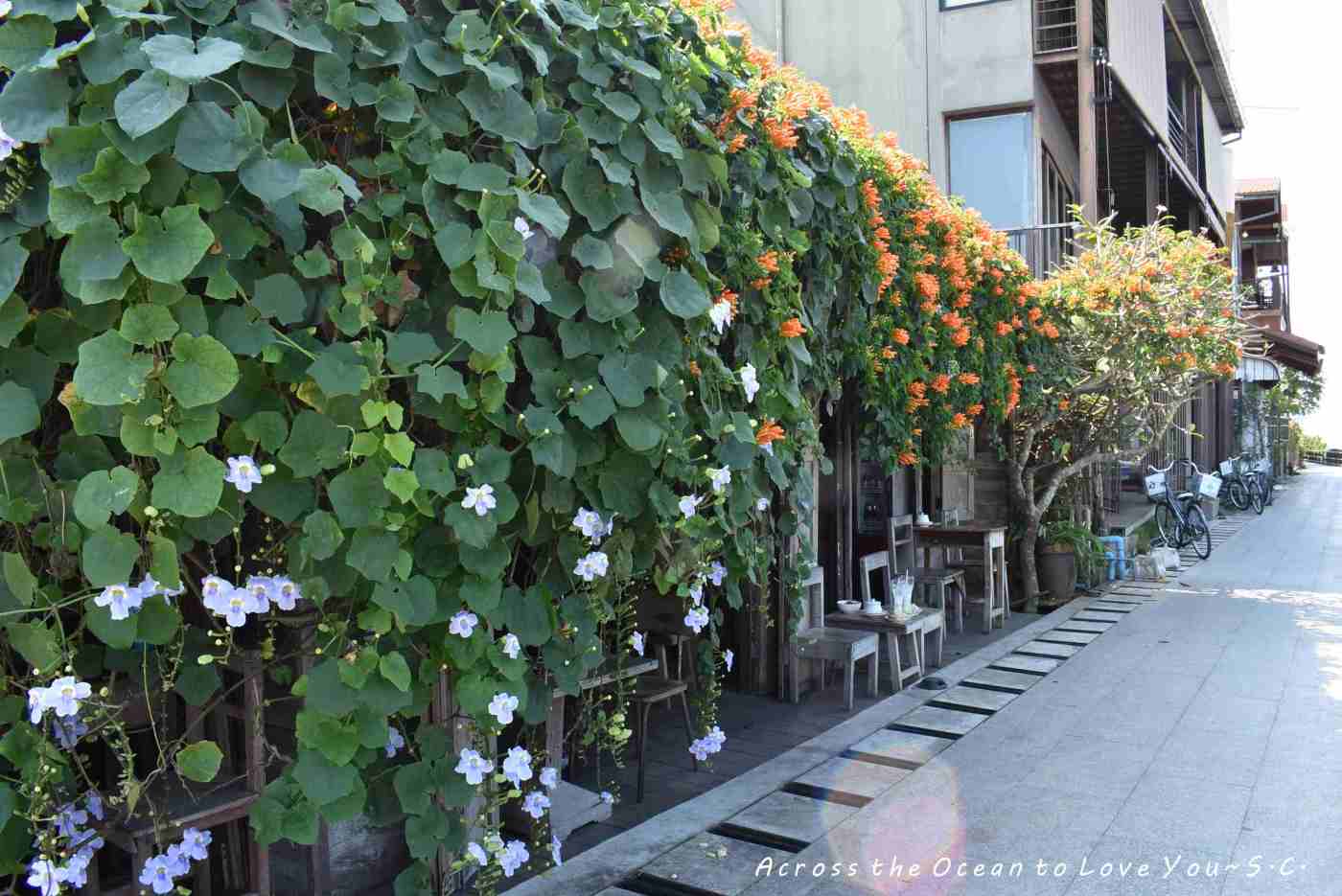 第一天在我對清刊Chiang Khan都不熟的狀況下,在老街頭,轉彎走到河邊,看到一處被橘色花蓋滿還夾雜著紫色小花的小小咖啡廳。沒想到在往後的三天,我天天都來光顧。