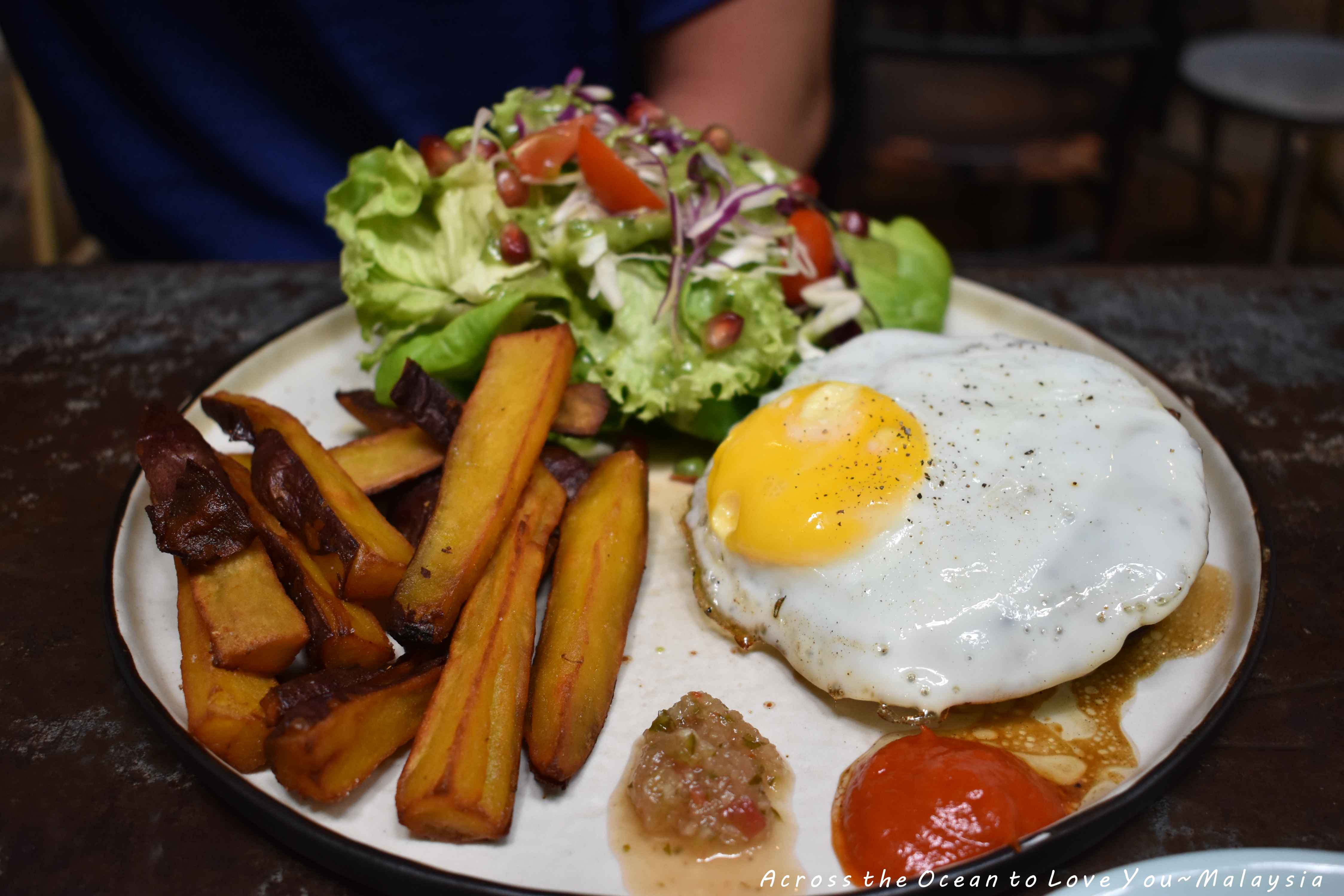 朋友點了餐點,薯條、荷包蛋、沙拉….><…有點妙的餐點。