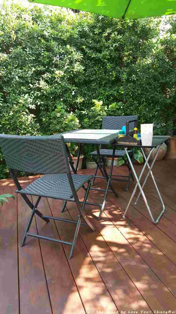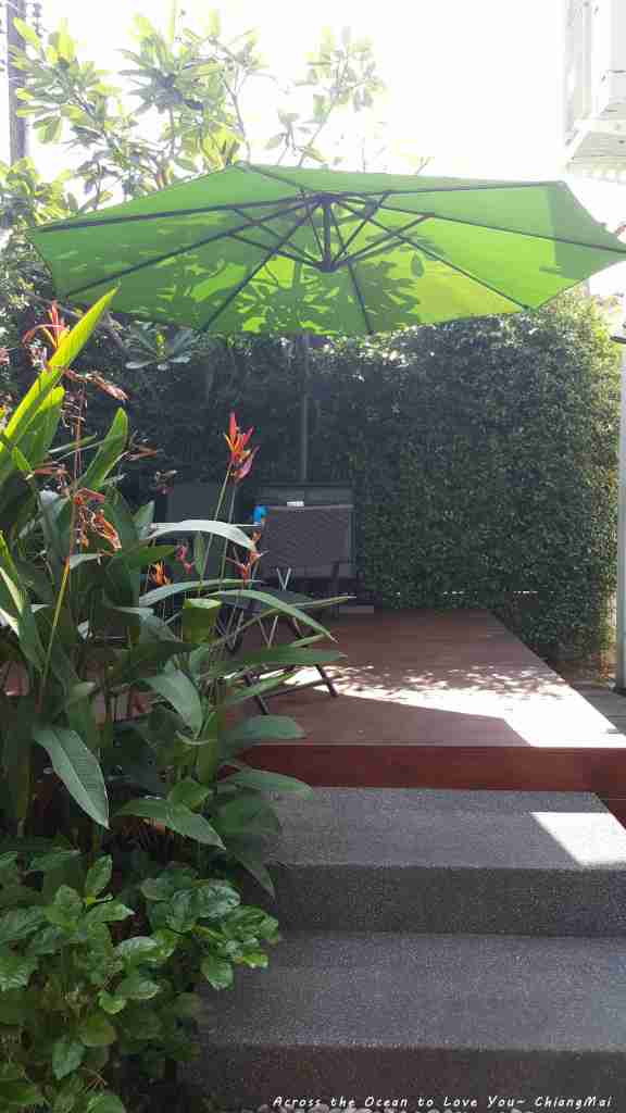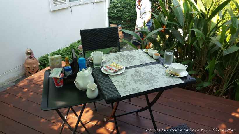 原來一樓後面有個安靜的庭院,隔天一早起來,我們被工作人員帶到一樓旁邊的小花園,一早太陽雖然大,帶有遮陽傘遮住炙熱的陽光。