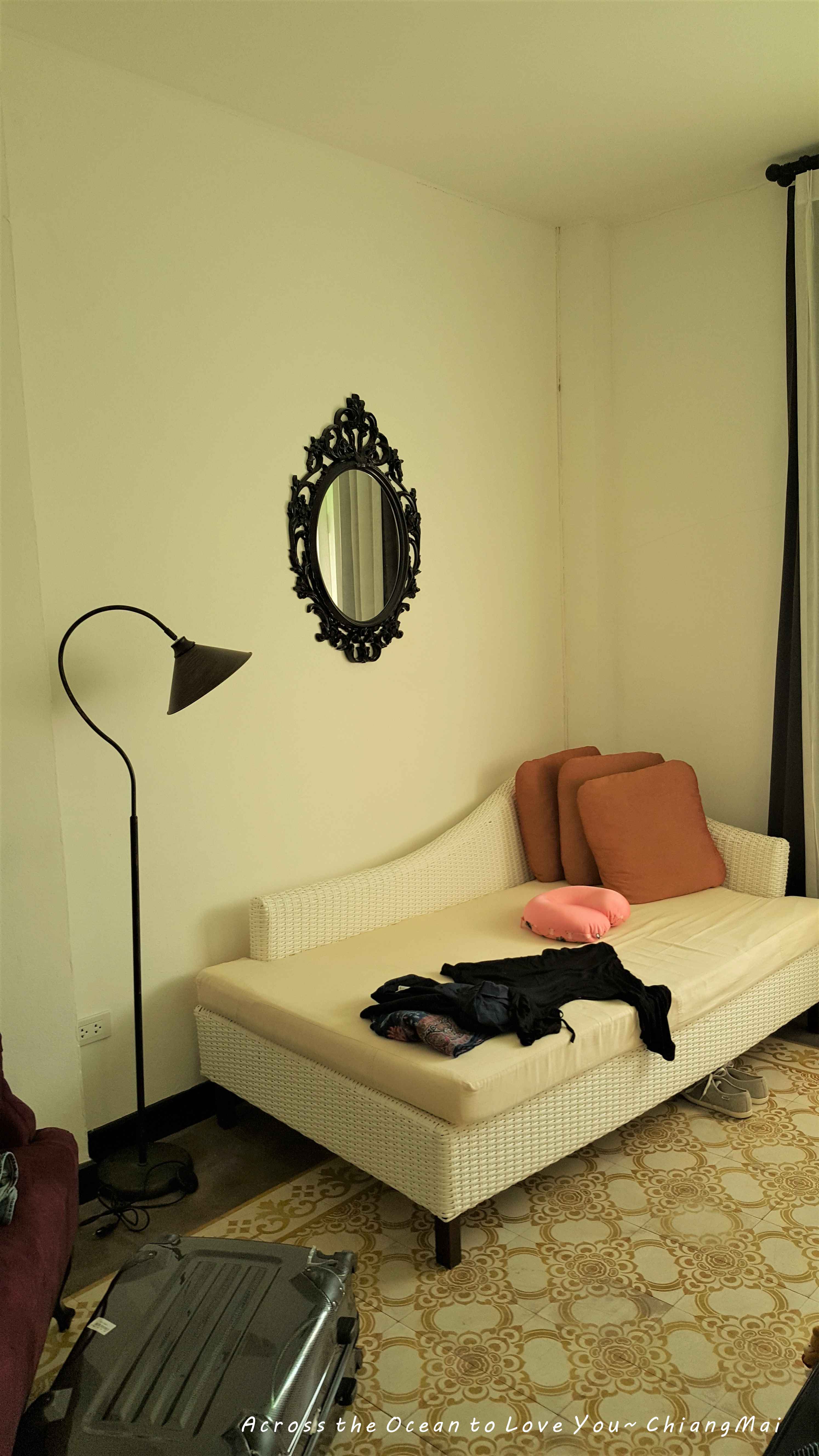 而我們的Good night房間設計一進門是像小客廳的白色沙發區,我們將行李放在這,這是一個開放的空間設計。