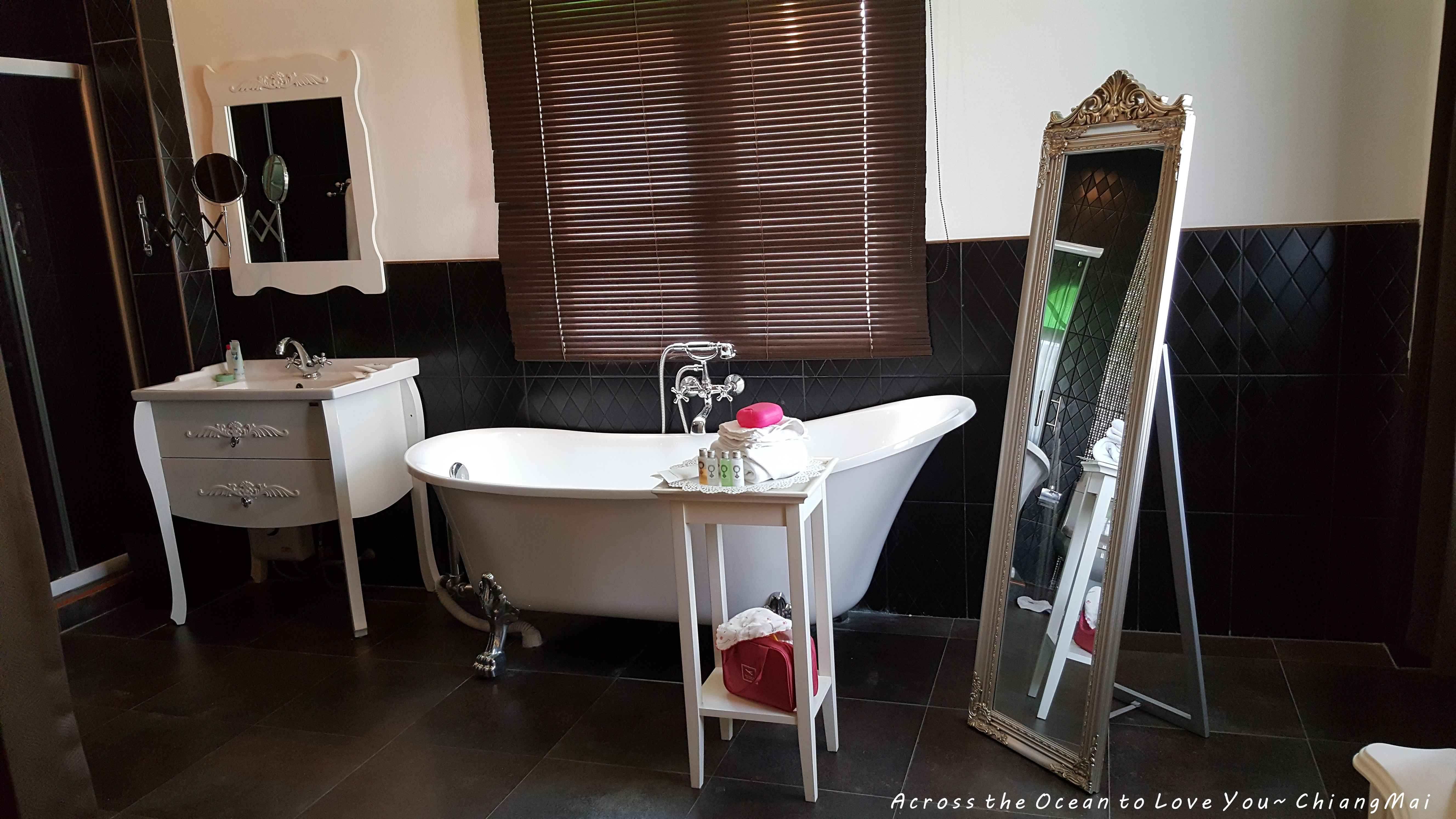 開放浴缸,只要拉上簾子,就是私密空間,泡澡都很浪漫,我好喜歡這種復古浴缸,整個心花怒放的感覺🥰~