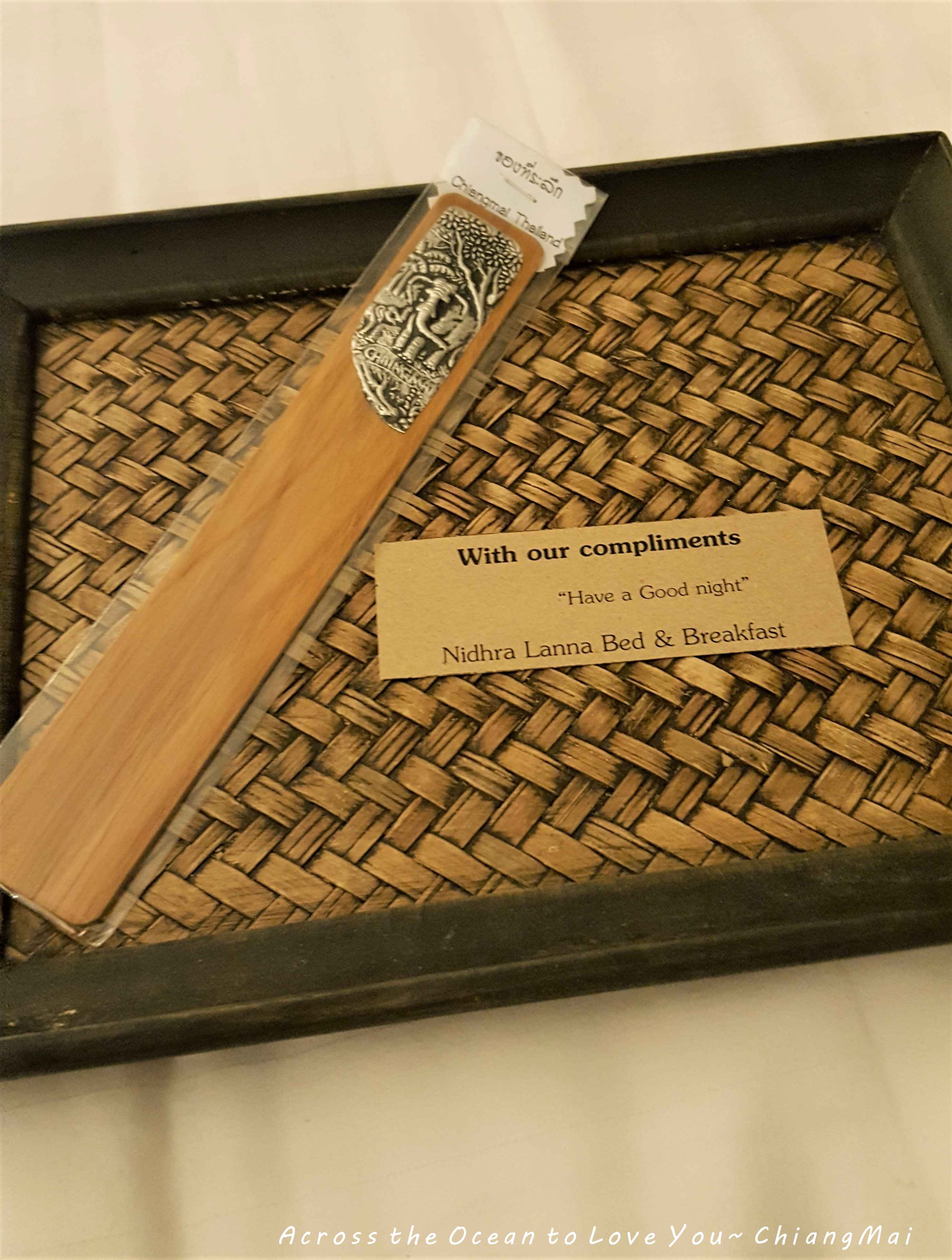 出去了一整天,晚上回到房間,工作人員已經先幫我們把燈打開,還在床上附送這個小書籤和耳塞,可能因為民宿位於馬路旁邊怕我們被吵到,真的很貼心。