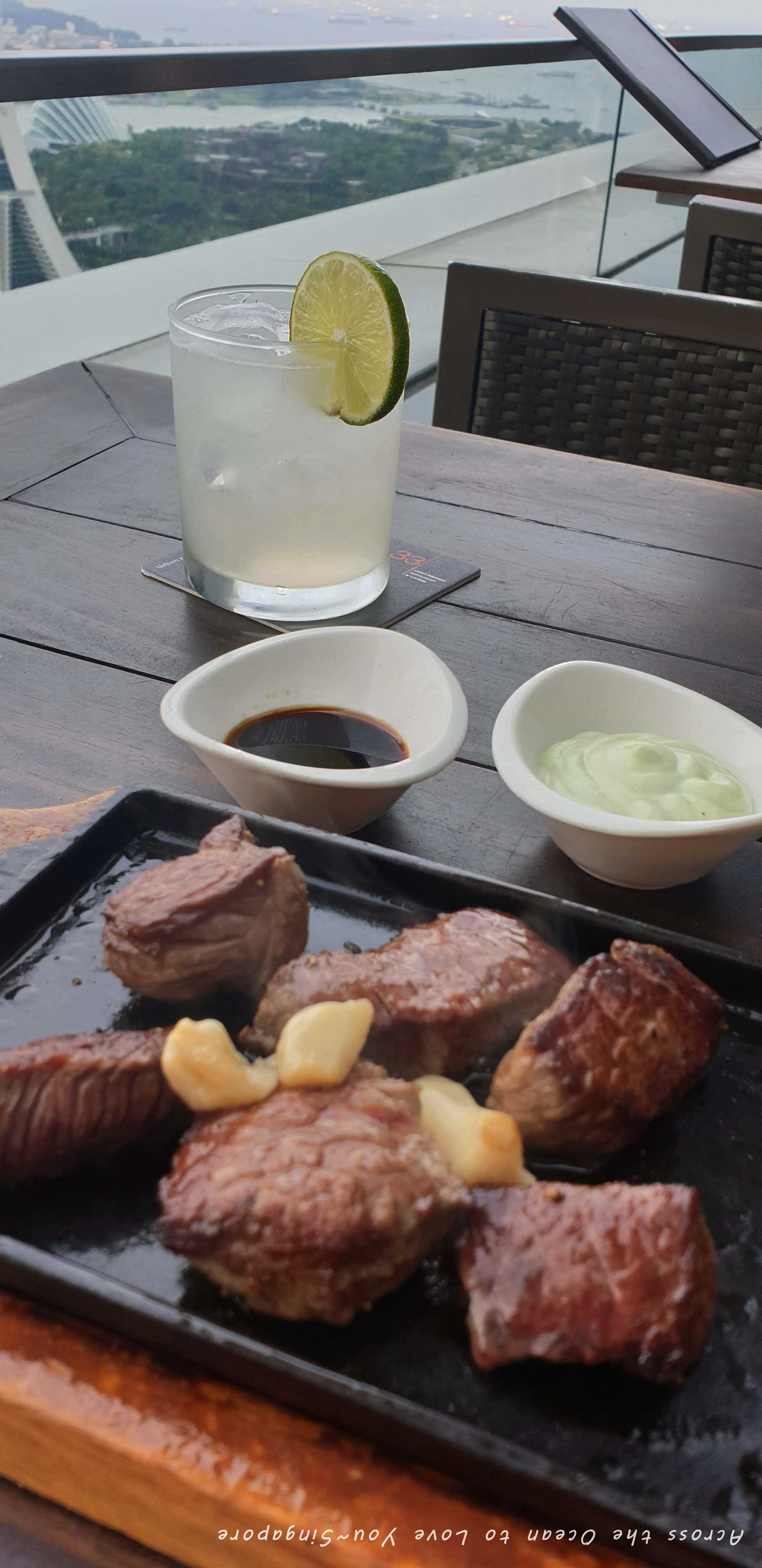 準時到5:30,剛在櫃檯的接待小姐過來再次確認我的英文名後,告訴我戶外的位置好了,順道幫我把飲料一起端過去。終於做到這個33樓高的戶外位置。這景色更是真實阿。