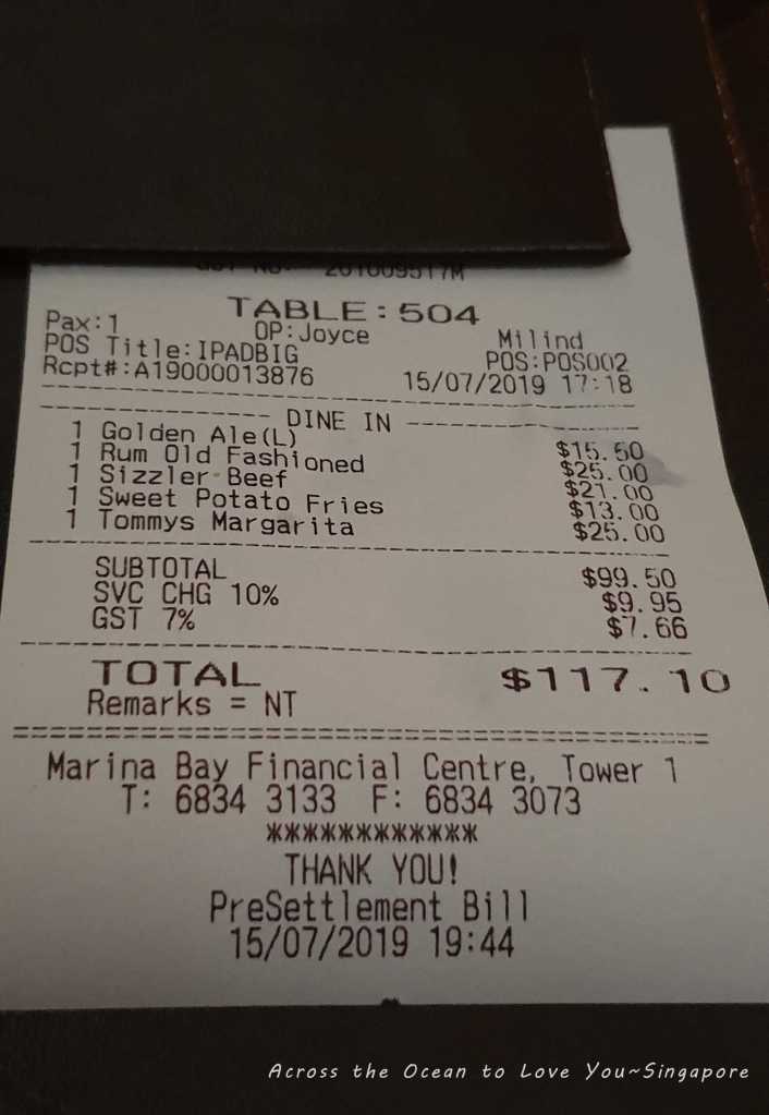 喝完一杯啤酒,我看著酒單上的Cocktails,平均一杯$25.00,我想換個雞尾酒,我點了杯 Tommy’s Margarita (Tequila, agave syrup, lime juice, salt),我還是比較喜歡碎冰的Margarita,這杯到沒有很驚豔。