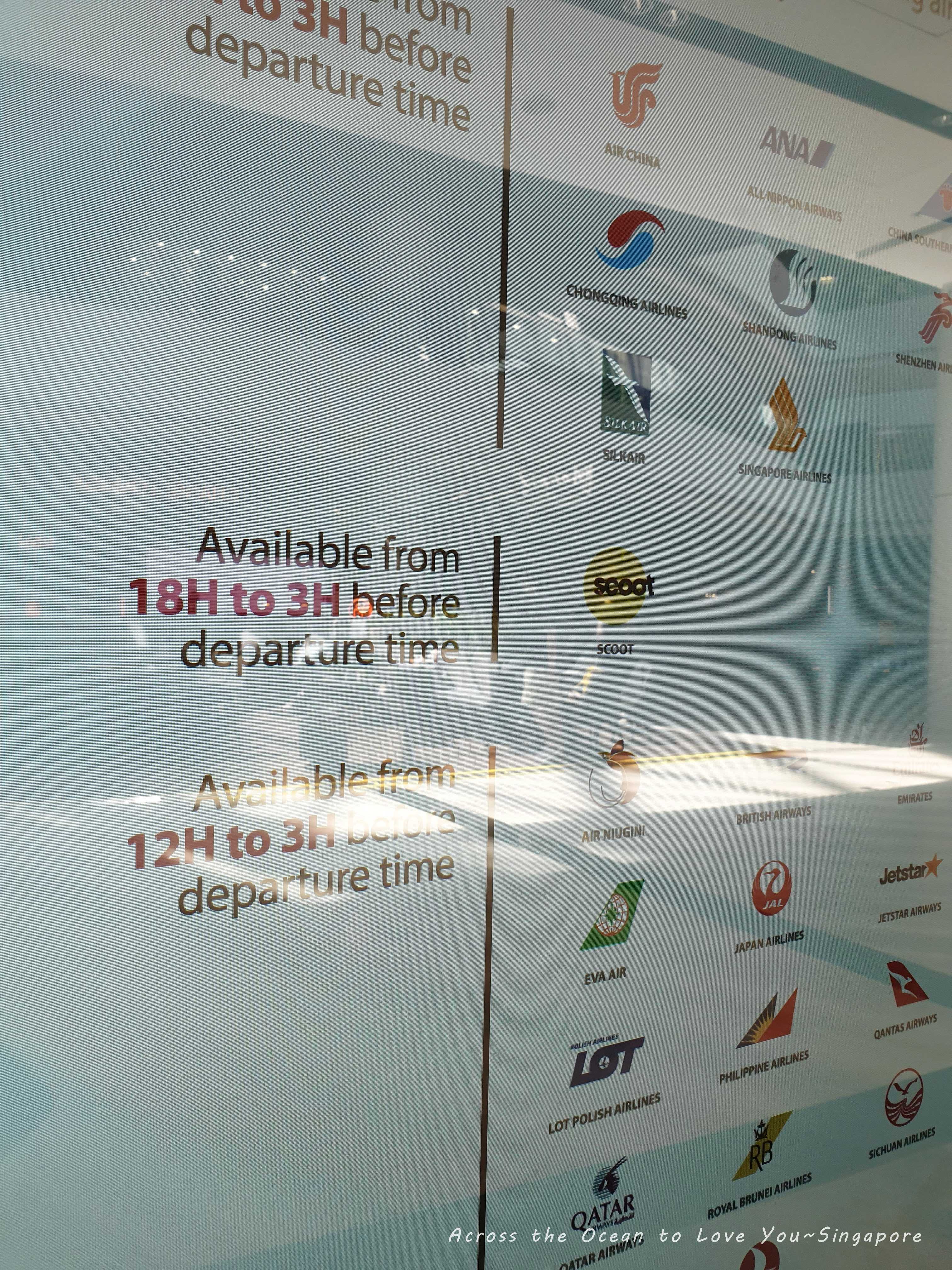 隨意在一樓閒晃,看到了星耀樟宜位於一楼的提前登機設施,資訊上寫著可在此提前辦理行李托運, 便可在登机之前逛逛星耀樟宜并且享受免提的便利。服務時間是每天早上6:00到晚上11:59。恩….不是24小時。