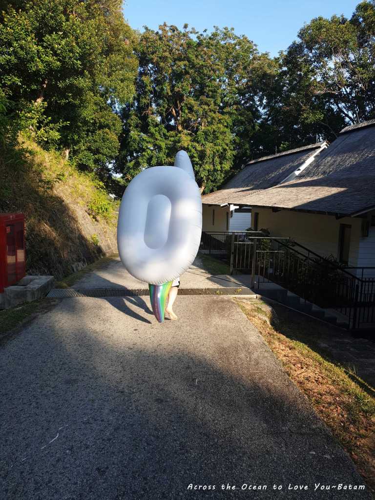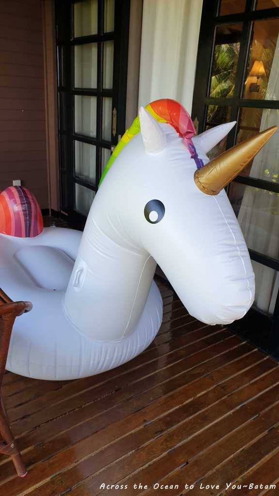 在巴淡島的周末睡到快中午起來,錯過了飯店早餐及10點多往市區的車子,工作人員還特地過來敲門確認怕我們錯過,服務真不錯。我起床後看到昨晚朋友幫我打好氣的獨角獸泳圈在陽台上真巨大阿。