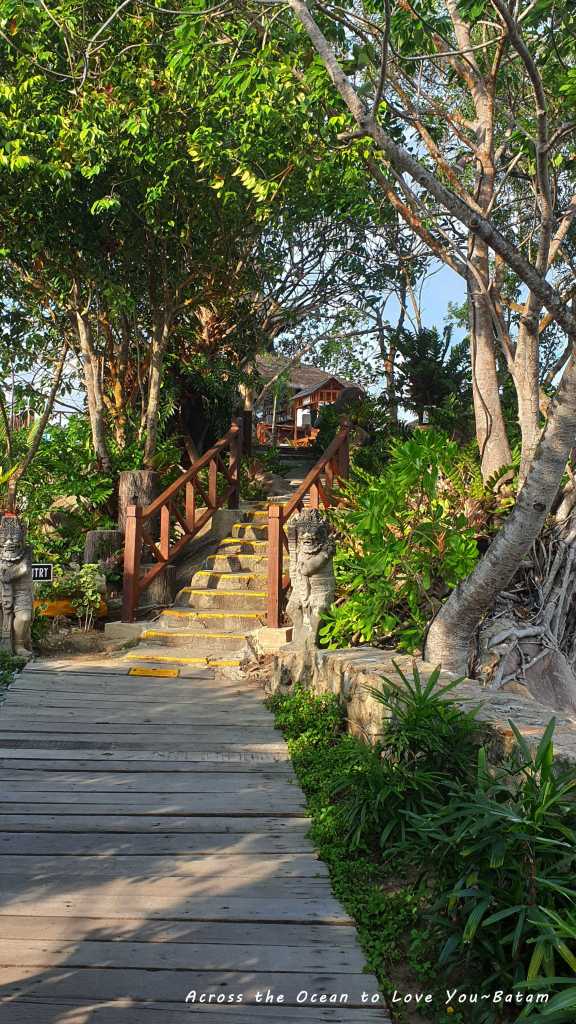 我已經很久沒有住過渡假村了,我們離開的房間去其他地方看看,查了一下渡假村占地還蠻大的。我們住第四排,沿著坡道走下去,會有飯店大廳、泳池、海邊。