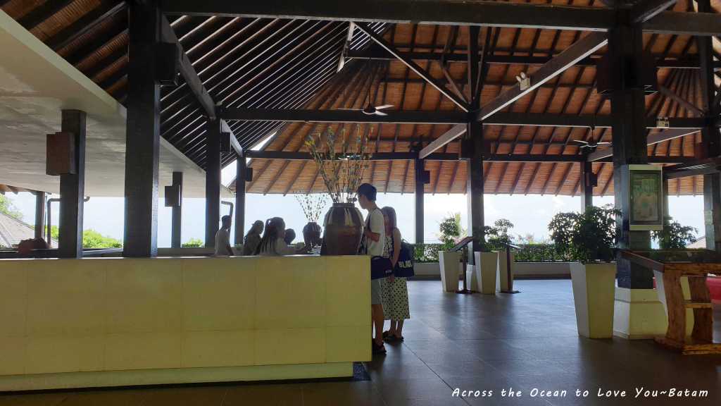 接待大廳是高挑木頭建築物,超大而且眼前就是一望無際的大海,太棒了。