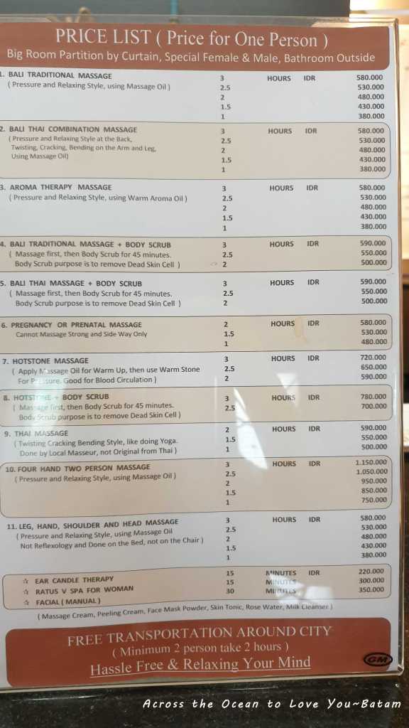 Majesty Spa & Massage Batam( 巴淡岛王权spa )就在 Nagoya Hill Shopping Mall斜對面,推開門就有一個先生問我有預約嗎?看起來應該是老闆,我看著桌上的價目表,研究好久自己要做哪些。