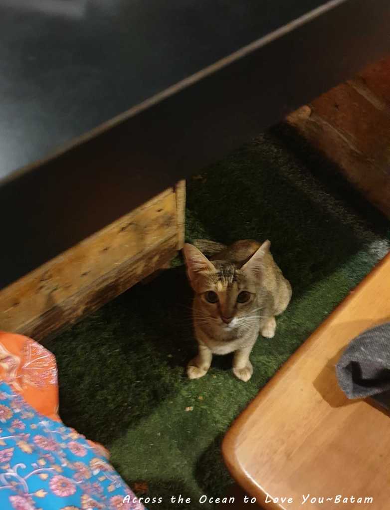 不知哪跑來的小貓一直在餐桌下,希望能要點吃的,我對貓沒抵抗力,我一直將魚去刺以後餵給小貓,小貓也非常乖都吃光,還會用前腳趴在椅子上看還有沒有,但只要我揮手說不可以,小貓都聽得懂,乖乖地坐在地上等我用給她吃,真是可愛。