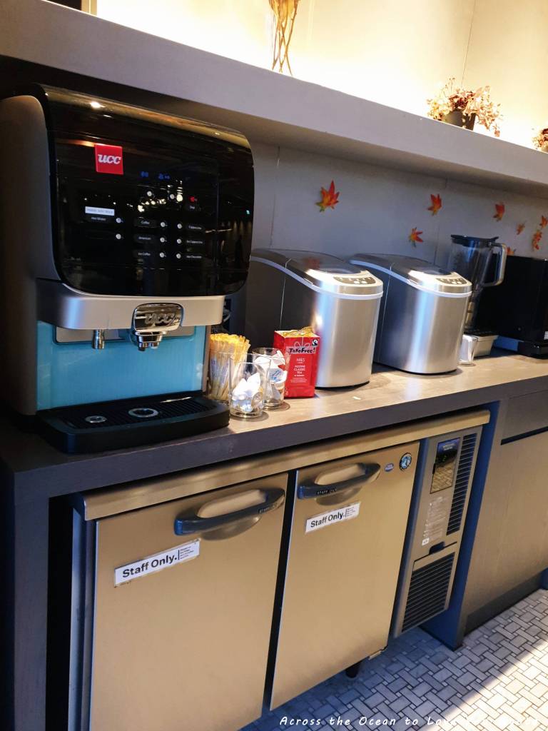 廚房吧台上咖啡機,有熱水、咖啡、可可等。