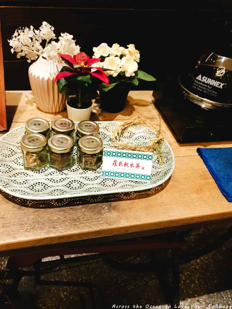 櫃檯前有著小小的吧台,放著引這個特色的茶水。仔細看好像是類似苦茶或是青草茶之類的,我也不確定,不過很有特色。