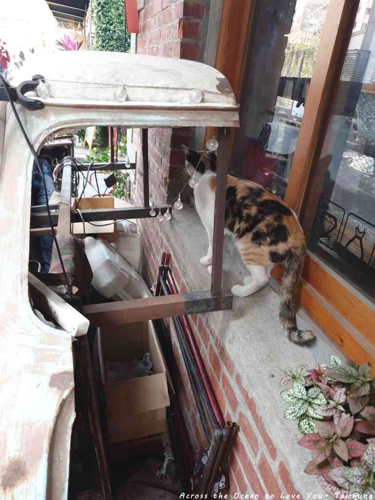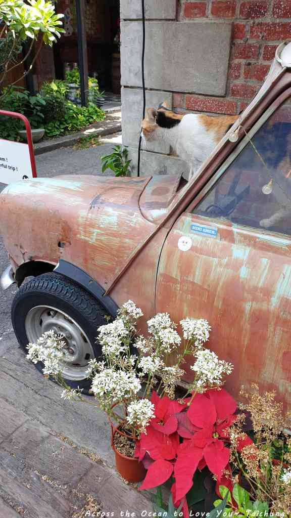 看來這個門口裝飾的廢棄車已經是花貓的家了,真可愛。