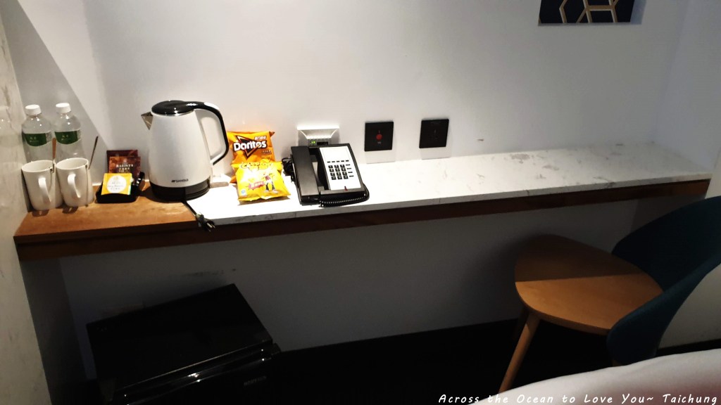 水杯、茶包、三合一咖啡、零食、快煮壺。