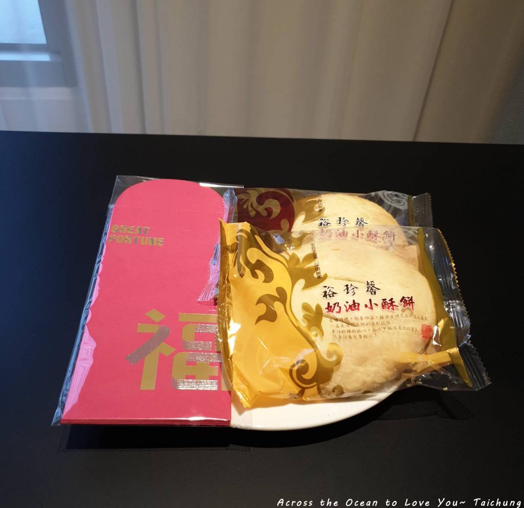 飯店提供了裕珍馨的奶油小酥餅,過年期間飯店準備的紅包,我連住兩天,第二天housekeeping時,工作人員會在補上奶油小酥餅和一份紅包…..哈。