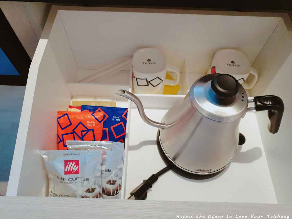 拉開書桌旁的櫃子,咖啡、茶包、快煮壺、杯子。