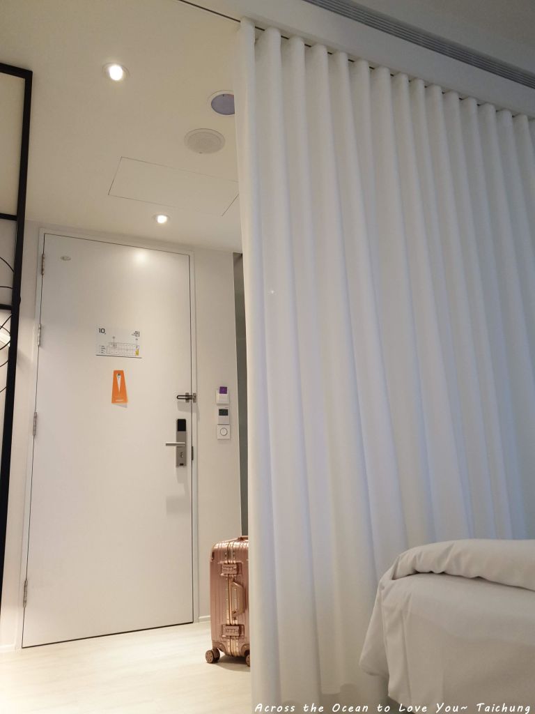 房間和玄關及廁所中間有白色布幔可以拉開當 隔離。這晚上開燈後,一個人睡覺開始幻想這好像醫院😂😂😂……..哈。