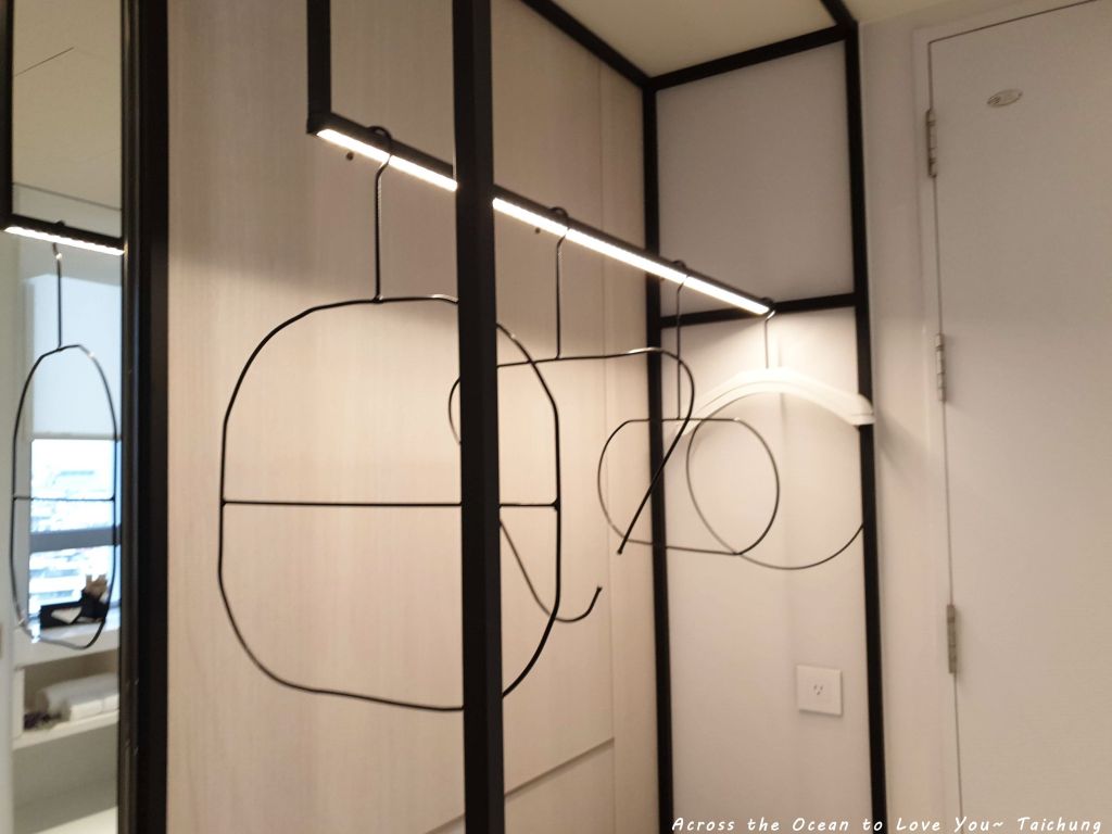 純白色的房間,搭配著幾何圖形,這個鐵衣架蠻多網友介紹,我覺得很有個性,和整個房間的tone很搭,不過若不小心掉在地上,因為是鐵製蠻大聲的。