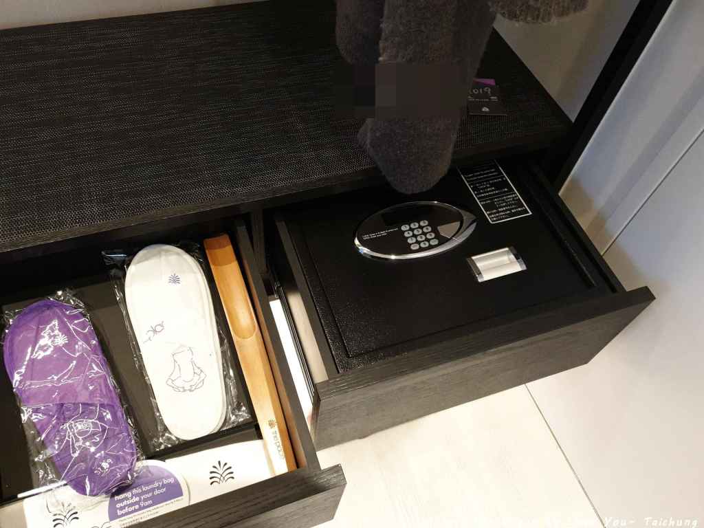 開放式衣櫃下是保險箱及拖鞋等物品。