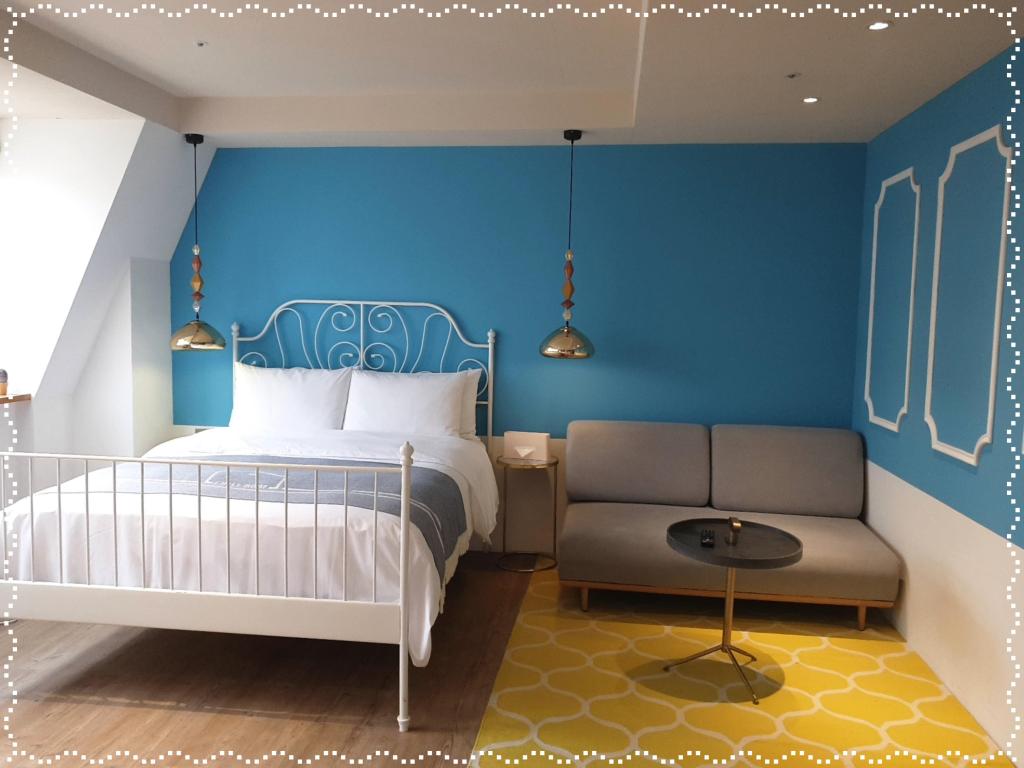 當我看到房間時,少女心噴發,實在太美了,藍色的牆壁,白色夢幻的鐵框床架,天啊~