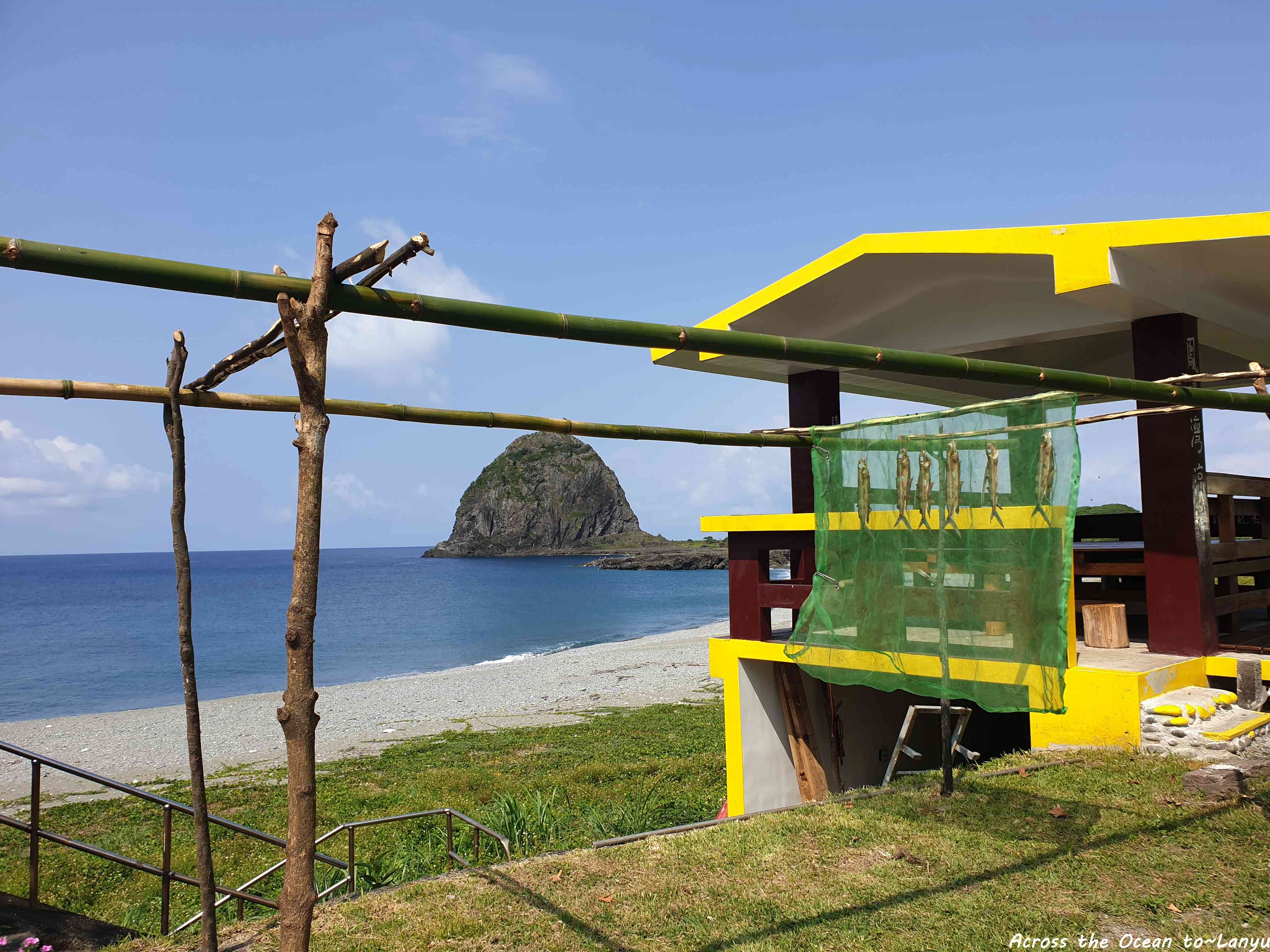 蘭嶼路上總是會看到居民曬著飛魚,在椰油國小前看到曬著飛魚,遠方是饅頭山,生活與自然毫不違背。
