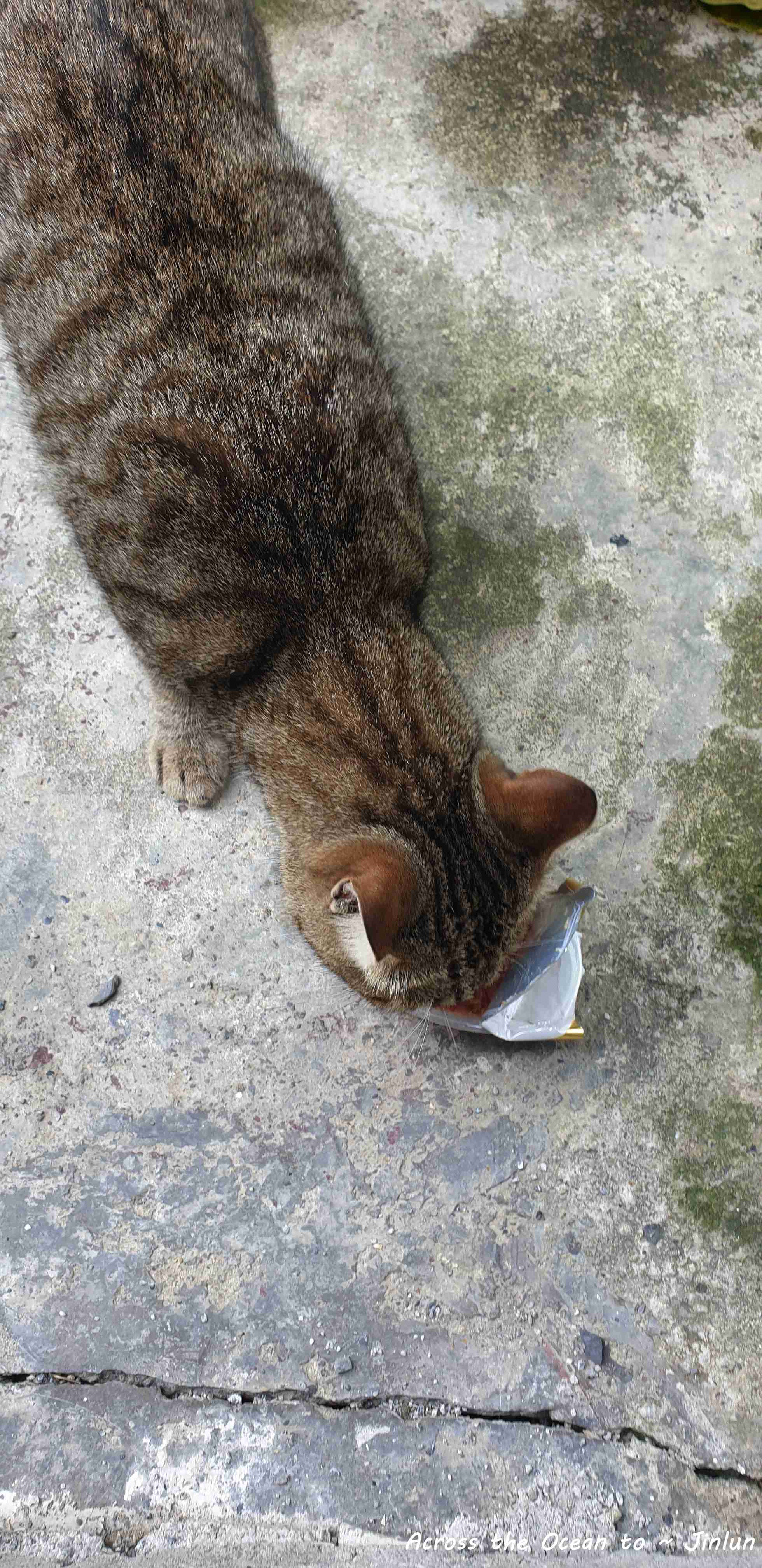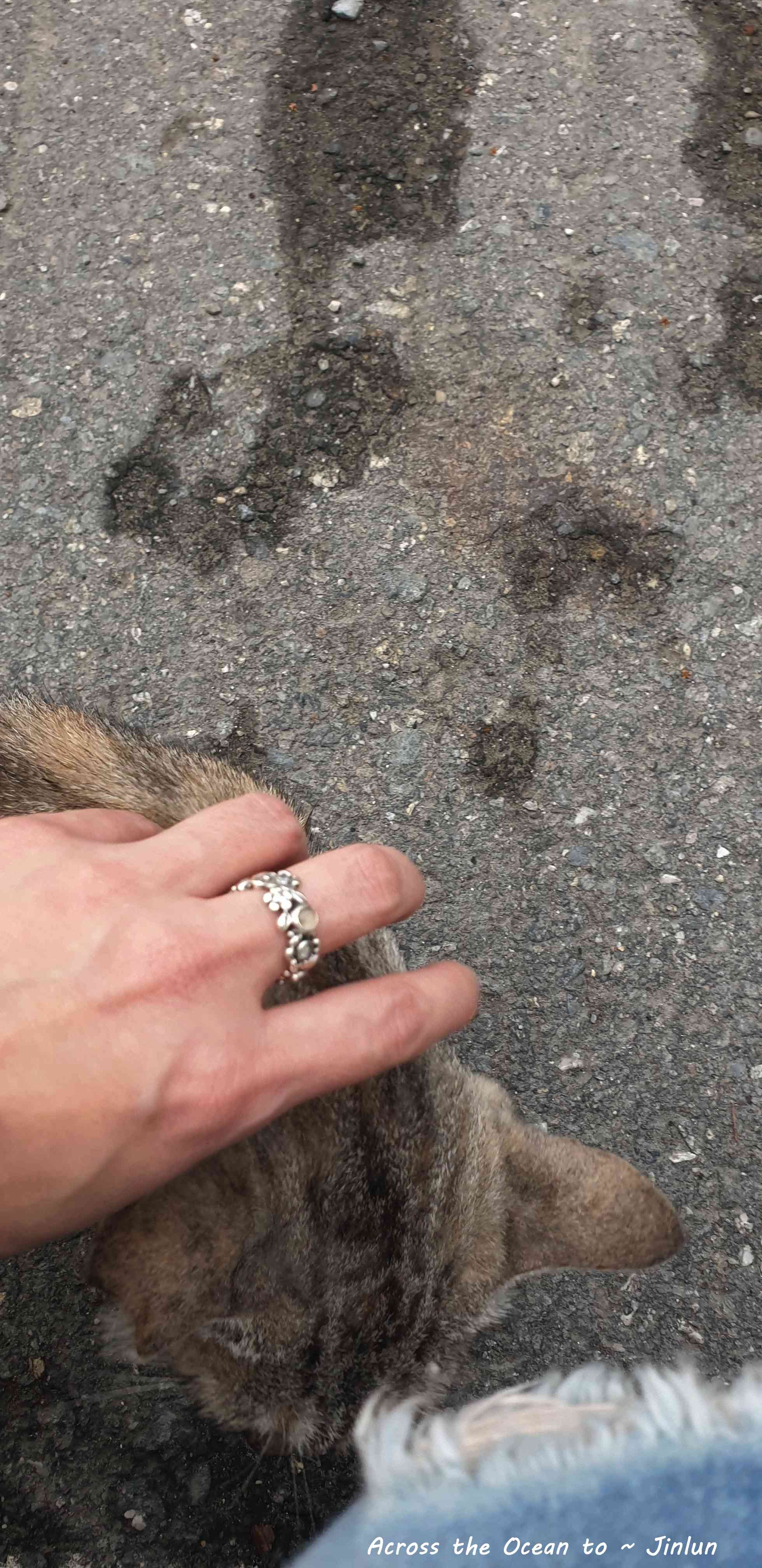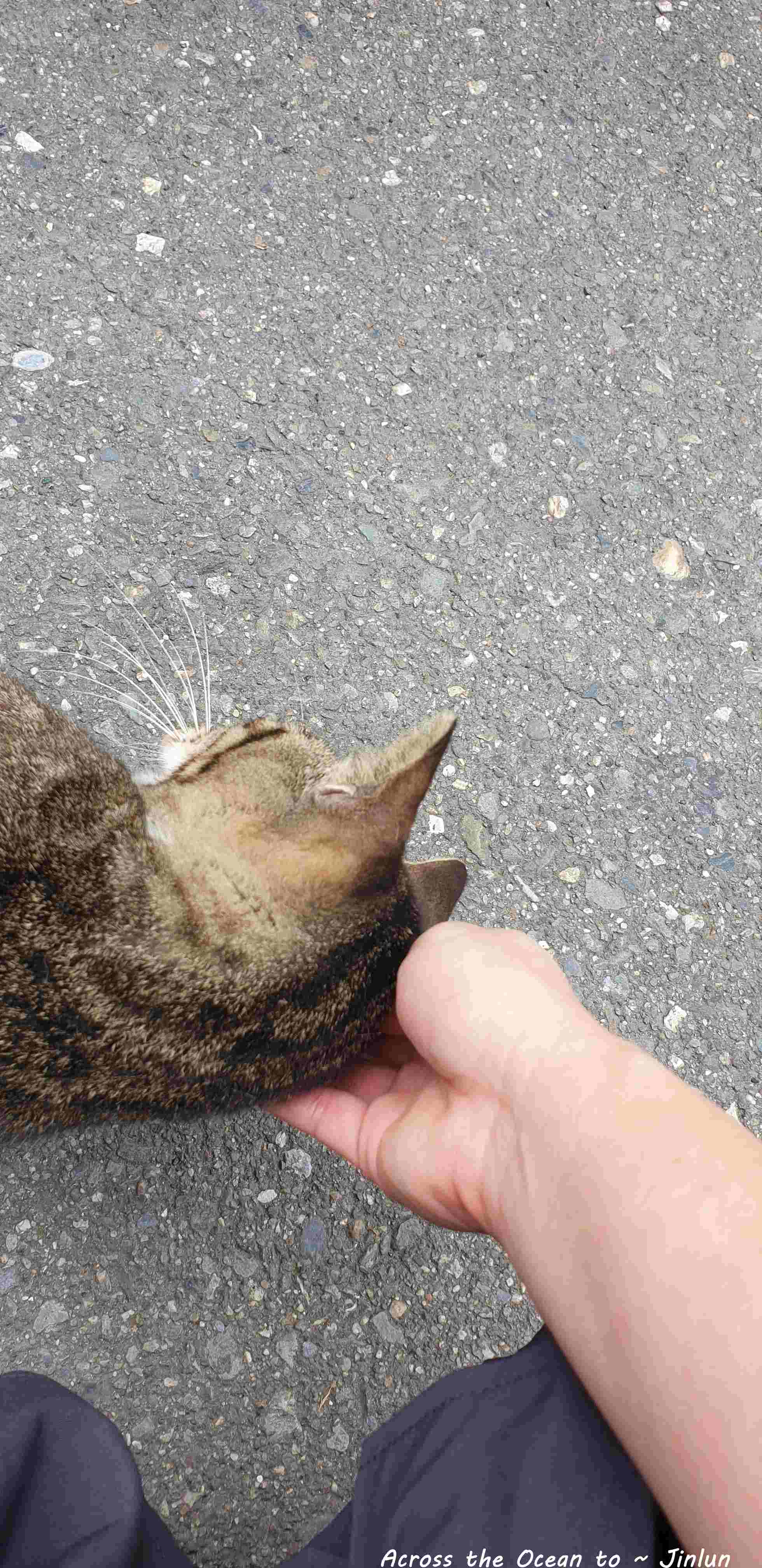 這隻虎斑貓真是超級聰明,安靜小心地躲進我的傘下,我拿了點超商買的罐頭請它吃,吃的超開心,整理了一下吃過的環境,我摸著虎斑貓的頭說,我後天要離開回台北了,希望你在這小鎮好好呦,下次我再來希望你還認識我😅。