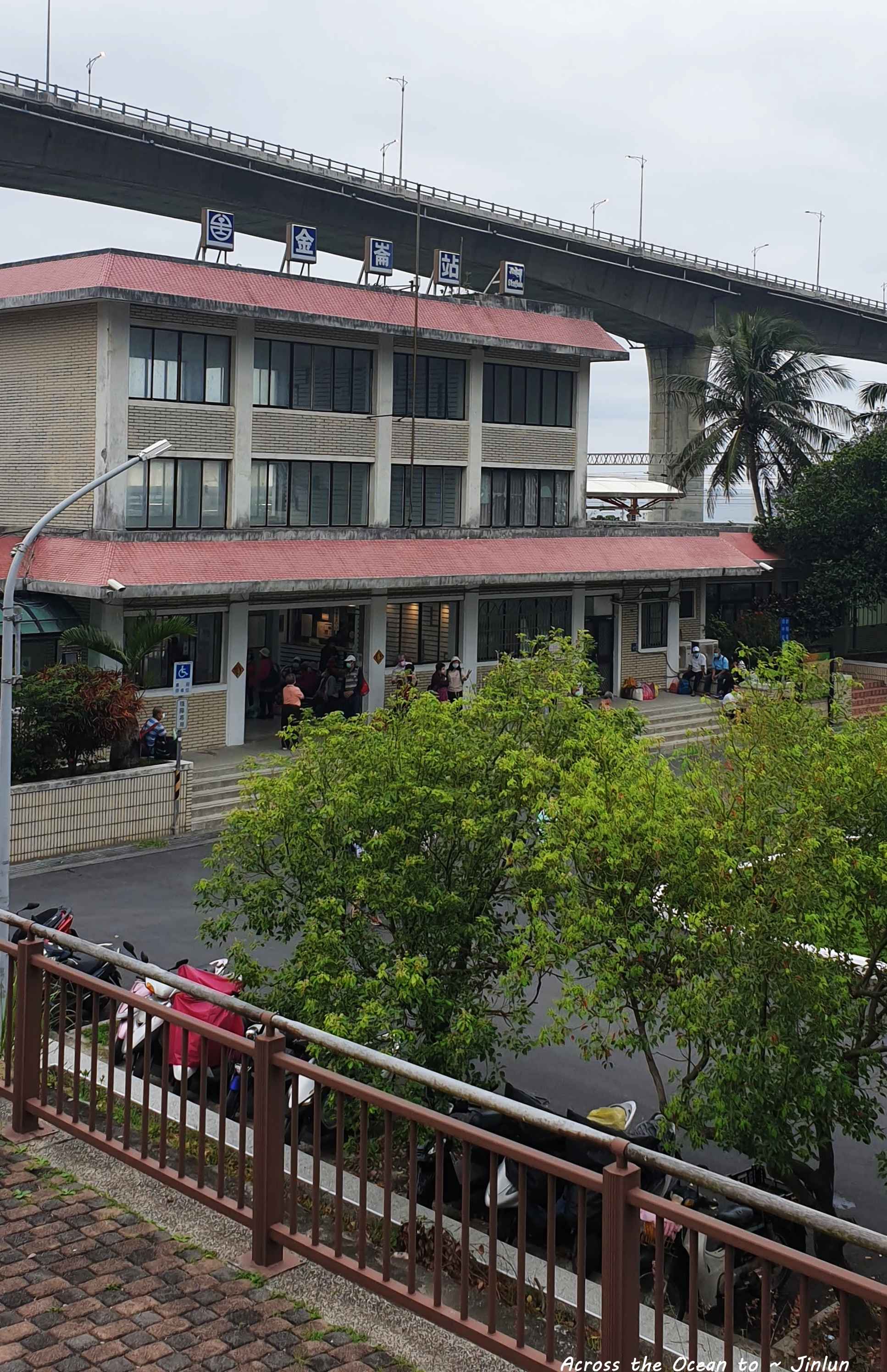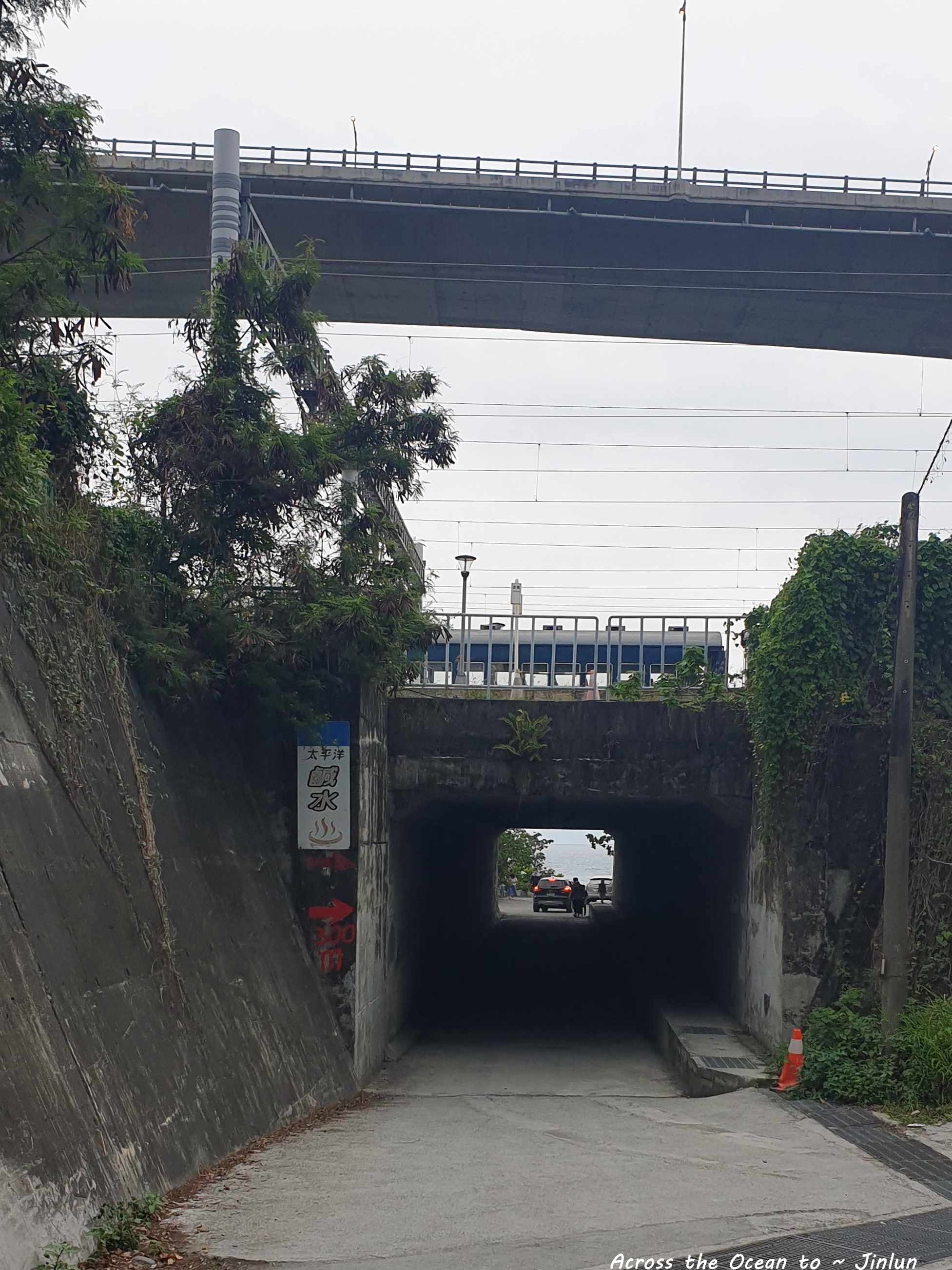 看來第二天的天氣比昨天更差了,天氣好時從涵2洞口就可以看到蔚藍的太平洋,但今天完全是灰色🙁,走到車站旁的台階上,可以遠望金崙大橋和小小的火車站,當特別來泡湯的遊客散去後,這裡又回到寧靜的生活。