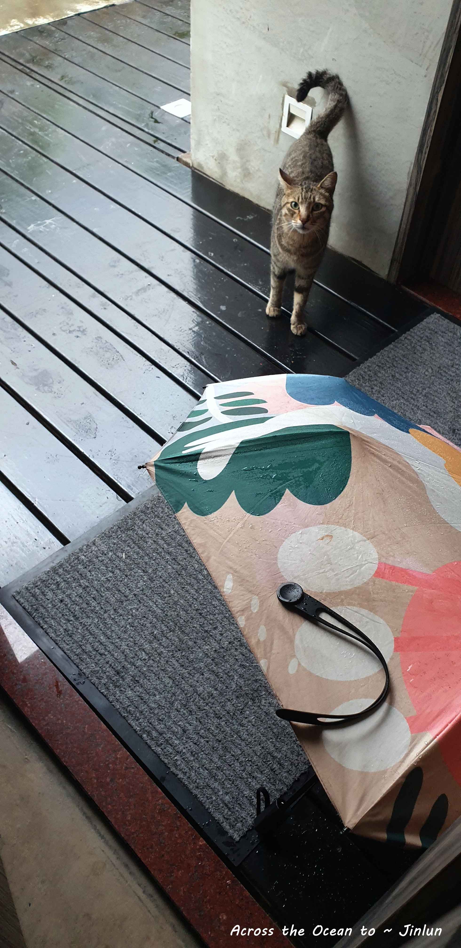 當我從咖啡廳走回來,沒想到在長廊上看到剛的虎斑貓,它站在旁邊不敢靠近門口,一邊舔毛一邊淋著雨,天啊,小可憐 阿😢。我趕緊將雨傘放在忙口,虎斑貓才敢慢慢地走過來,似乎了解我要它在傘下躲雨。