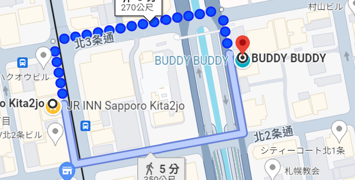 從飯店JR INN Sapporo Kita2jo (JRイン札幌北2条)向左轉進入北3条通,再左轉進入西2丁目通,就會看到BUDDY BUDDY 整棟餐廳。走路只需要5min。