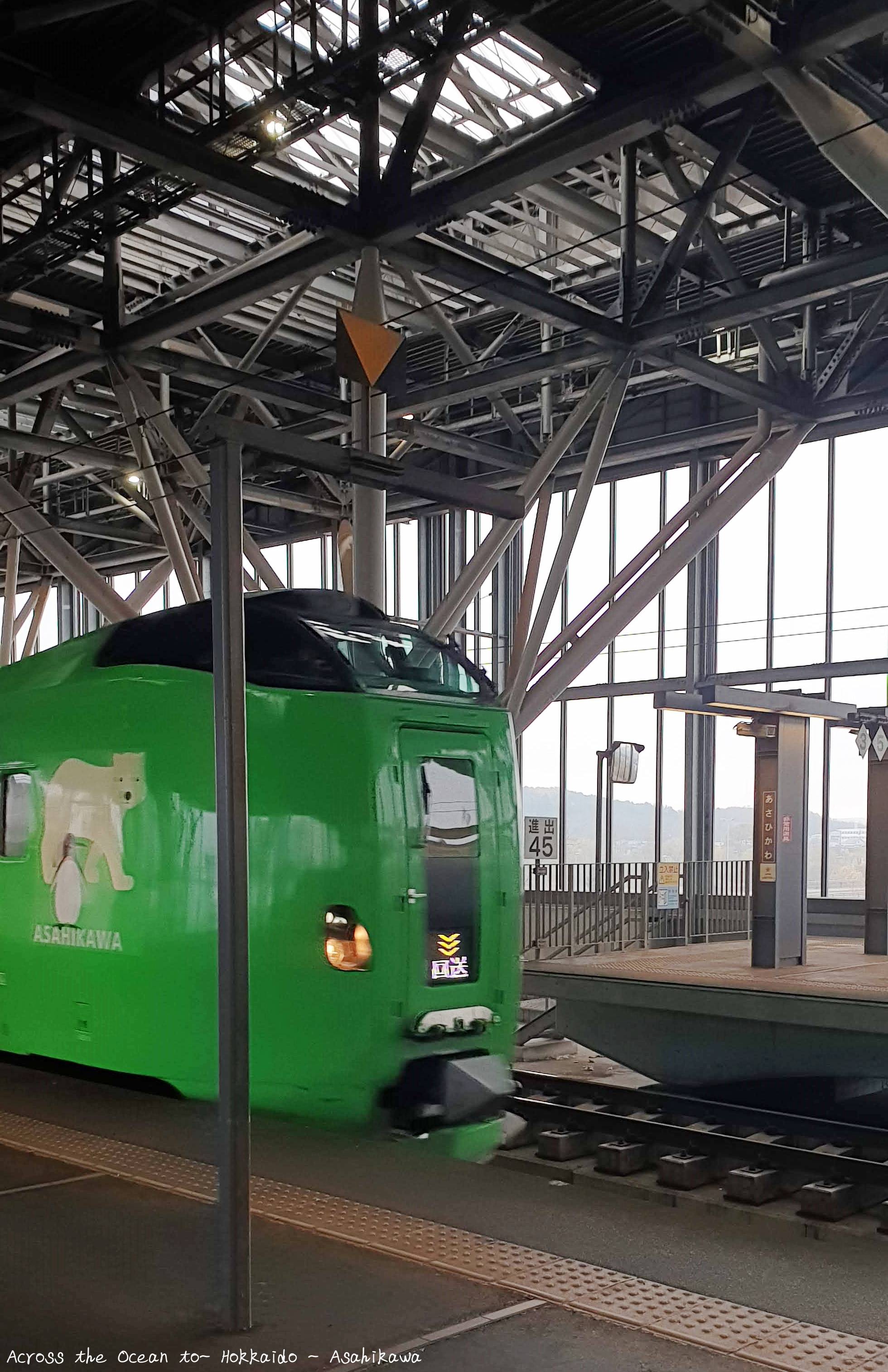 在等待9點往札幌的火車時,看到月台回送的列車,WOW~好可愛的綠色車廂,我注意到車廂上的北極熊和企鵝裝飾,這應該是代表旭川的旭川動物園最吸引觀光客地動物,真是可愛又特別。