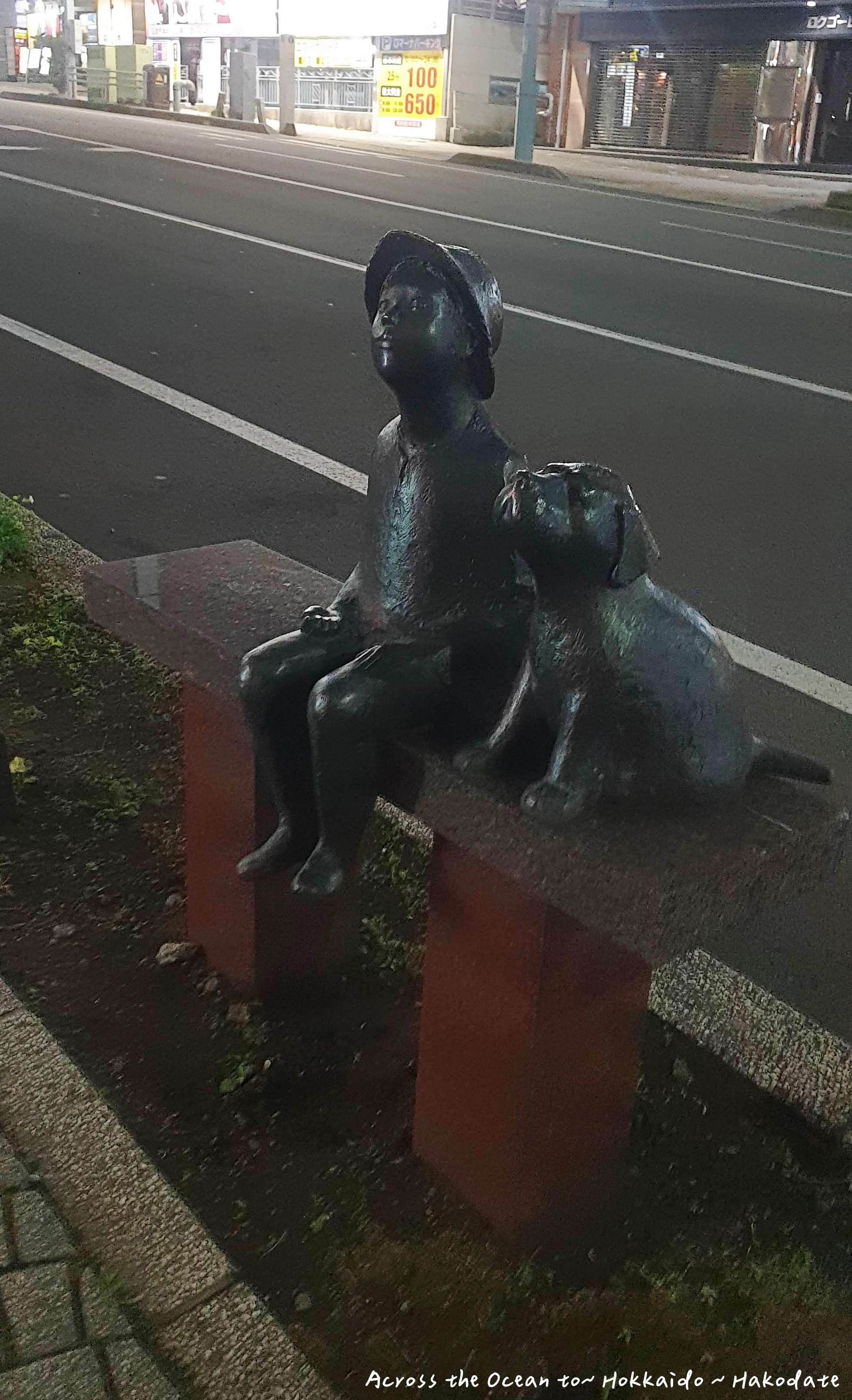 準備去飯店附近找吃的,發現函館路邊有著可愛的裝置藝術,讓我想到札幌二條市場也有各石頭做的裝置藝術,不知道這個小狗和小朋友的裝置藝術有沒有特別的含意。
