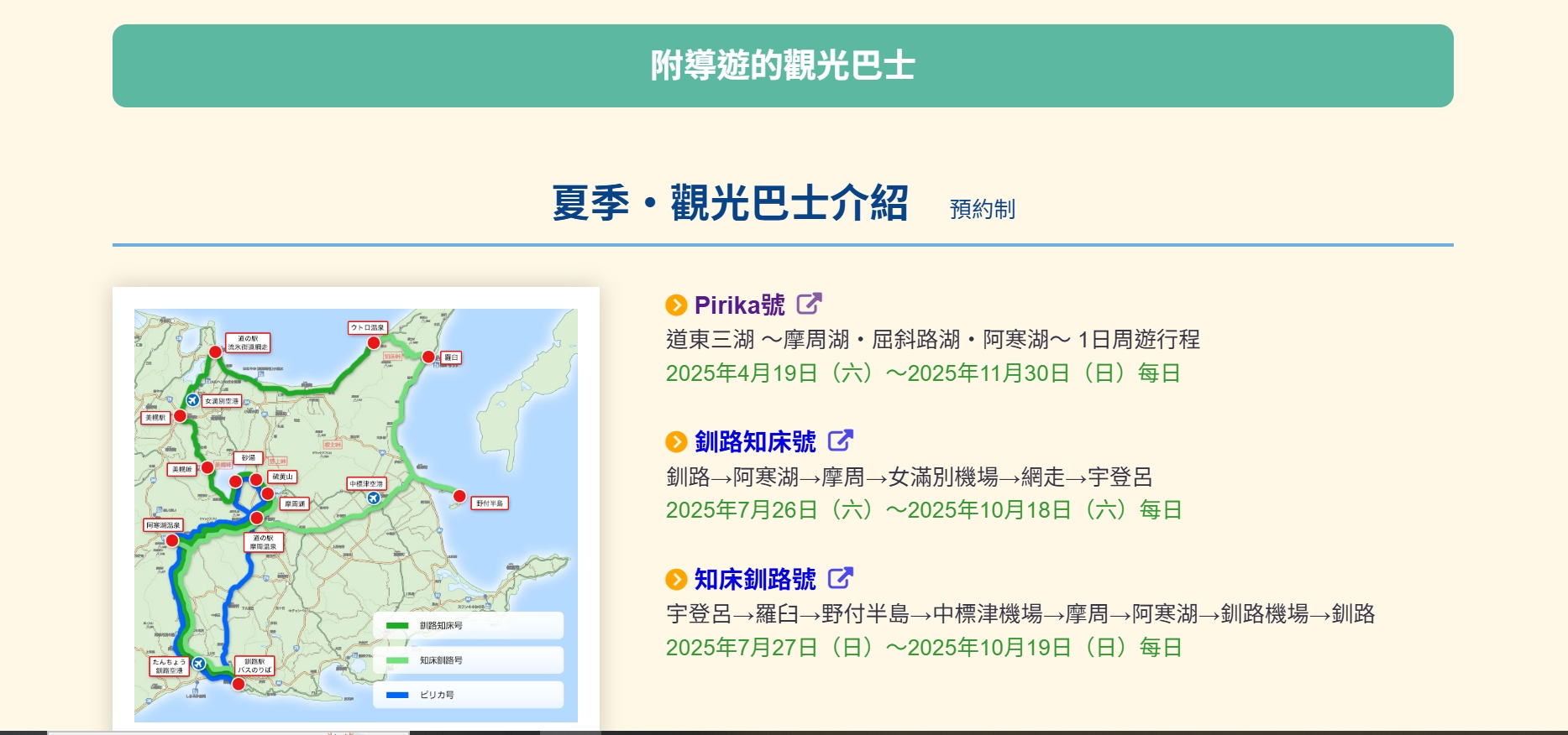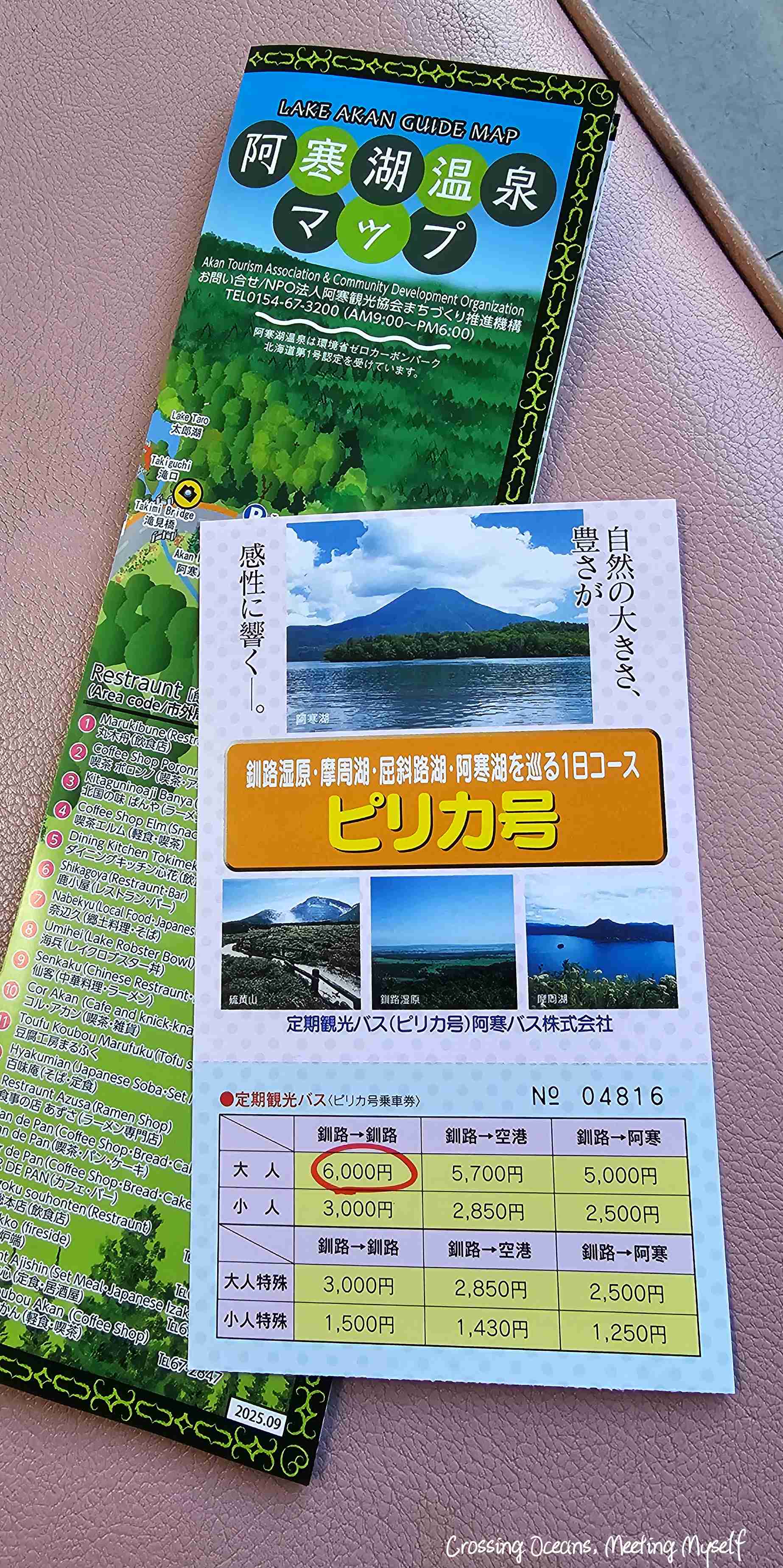 ⇩ 於是我在尋找交通工具時發現了阿寒巴士公司的附導遊的觀光巴士行程。➵https://www.akanbus.co.jp/foreign/tw.html。有夏、冬兩季的一日行程,我的時間剛好是11月下旬,我決定參加Pirika號(道東三湖 ~摩周湖・屈斜路湖・阿寒湖~ 1日遊行程),遊客可以選三個地方上、下車(釧路站前巴士轉運站【8:00發】、MOO巴士轉運站 【8:05發】、釧路Prince Hotel),總站來回是¥6,000(夏季費用)。