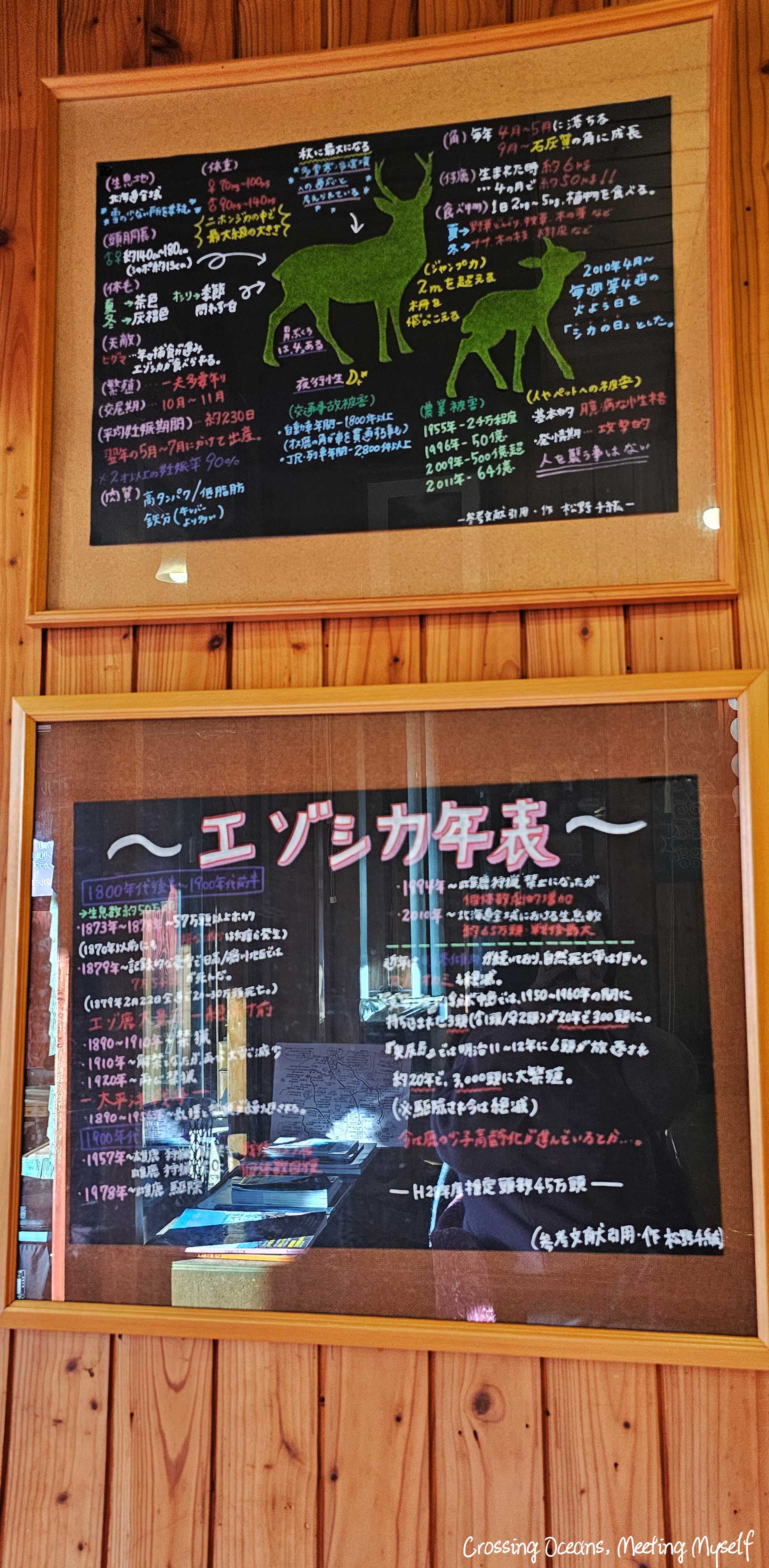 門口是菜單嗎? 恩~不是,是介紹鹿的一些專業知識,恩~對我來說太難了。走進店哩,一個坐在席間的老奶奶一直和我說日文,我不知道她是老闆還是熟客,一陣尷尬後,工作人員(應該是女老闆)用英文快速的請我找位置並送來菜單和冰水☺️😅。事後我覺得老奶奶也是這家店的老闆之一吧,哈哈哈。