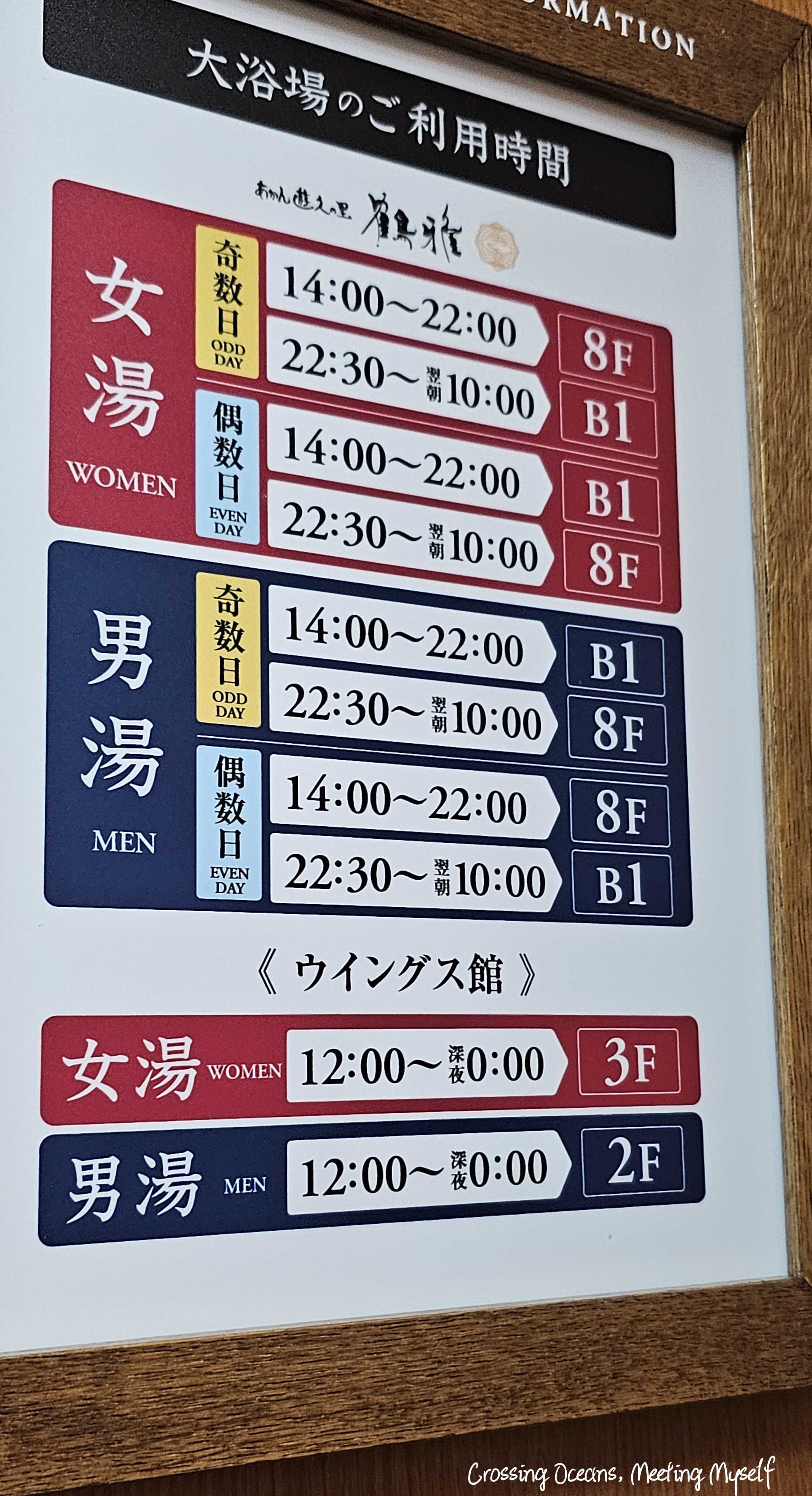 依照櫃檯工作人員指引,我來到往上的電梯,這邊很清楚地告知奇數日14:00~22:00可以去本館8F 天空露天風呂 天女の湯・展望大浴場 天の原,偶數日14:00~22:00換男性可以去8樓這也是當初我20號晚上到釧路後,我一定要在21號參加一日遊去阿寒湖,去我嚮往的阿寒湖戶外溫泉。