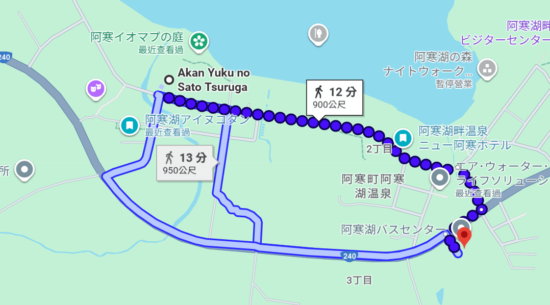 從阿寒遊久之里鶴雅飯店走到阿寒湖巴士中心(阿寒湖バスセンター)若不被沿途景色分心,應該只要12分鐘。等於直走大街右轉直走就看到了,非常好找,一開始我還擔心。