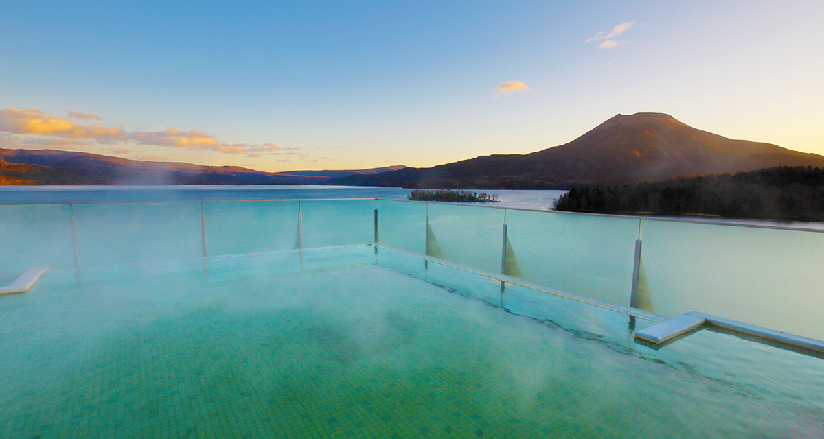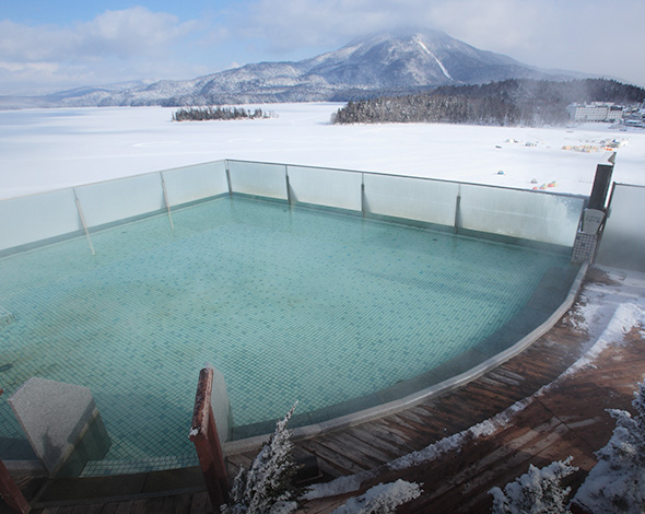 換了衣物就是直接進去室內溫泉,先洗身體,此時看到三個女生也在洗澡,除此寬廣的室內溫泉浴池完全沒人,我想會不會大家都去8樓了戶外溫泉。我先走進室內溫泉浴池…wow~對我來說水溫很高,有點受不了,不管了,我要直接去8樓,準備好裸體走出戶外,走一段樓梯,wow~戶外的景色太美了,只有一個女生在泡湯,不一會她也離開了,我竟然有機會獨享一整個戶外池,我看的遠方的阿寒湖,太陽下,我當下真的覺得好像在天堂,特別是辛苦工作後,此時一切都享受都太棒了。無法拍照,借用飯店官網站片來懷念當天的景色。