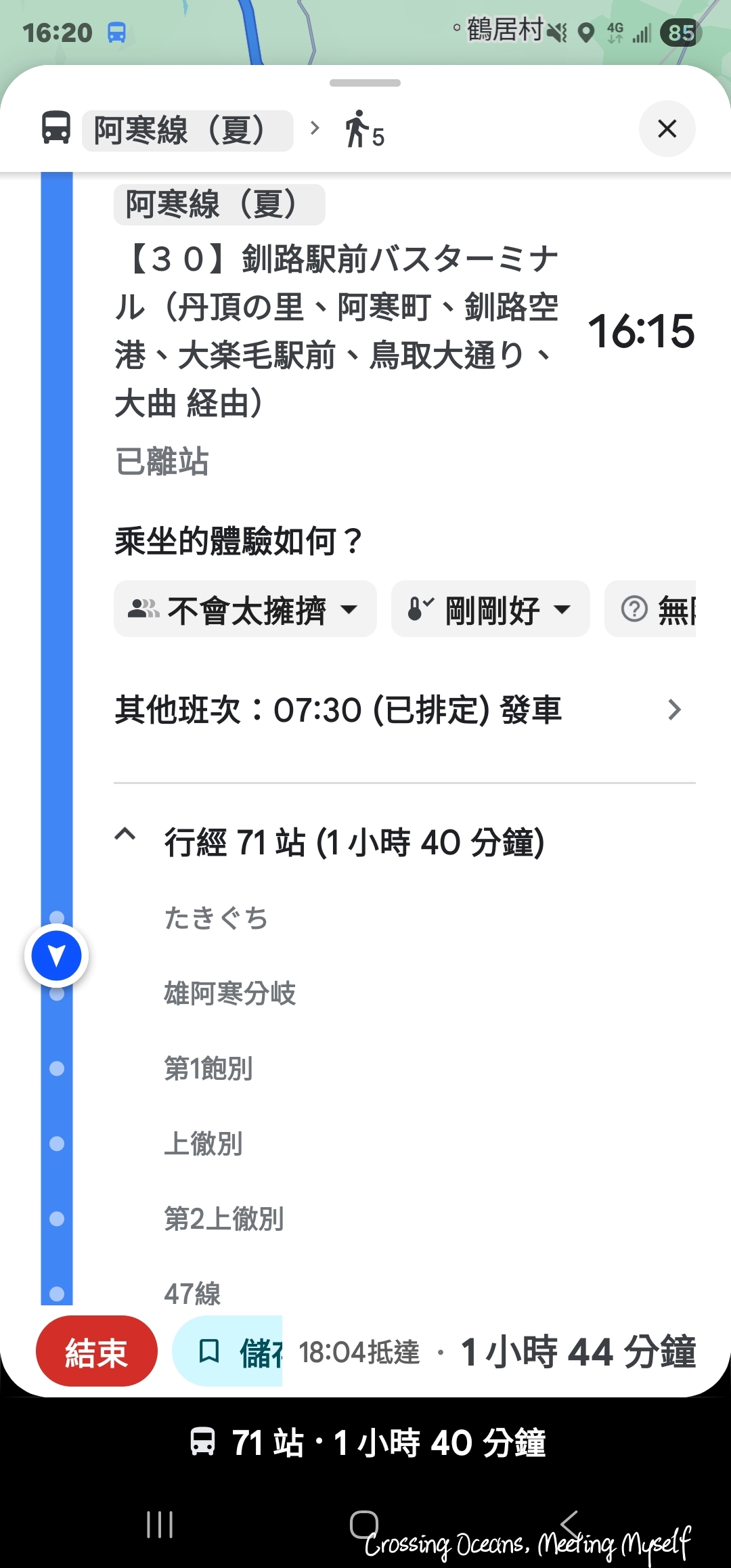 16:15發車,天已經黑了,我還是很不習慣北國4點多天黑,雖然已經是第三次來到北海道,我用著Googel導航,這一路車程快2個小時,途中要經過70多站,好厲害。司機不像以忘我遇過的日本司機,更像我天天搭成的台灣公車,司機幾乎是用飆車的精力再開,我差點要問旁的阿姨,司機在日本可以這樣開車嗎? 實在是太有趣了,沿途經過幾個很偏僻的站,真的有人上車,我想應該都是在當地工作的人員在等這最後一趟回釧路市區的巴士,所以這個班次很重要,司機的心情應該是我要準時趕到站點,不要讓乘客等待。