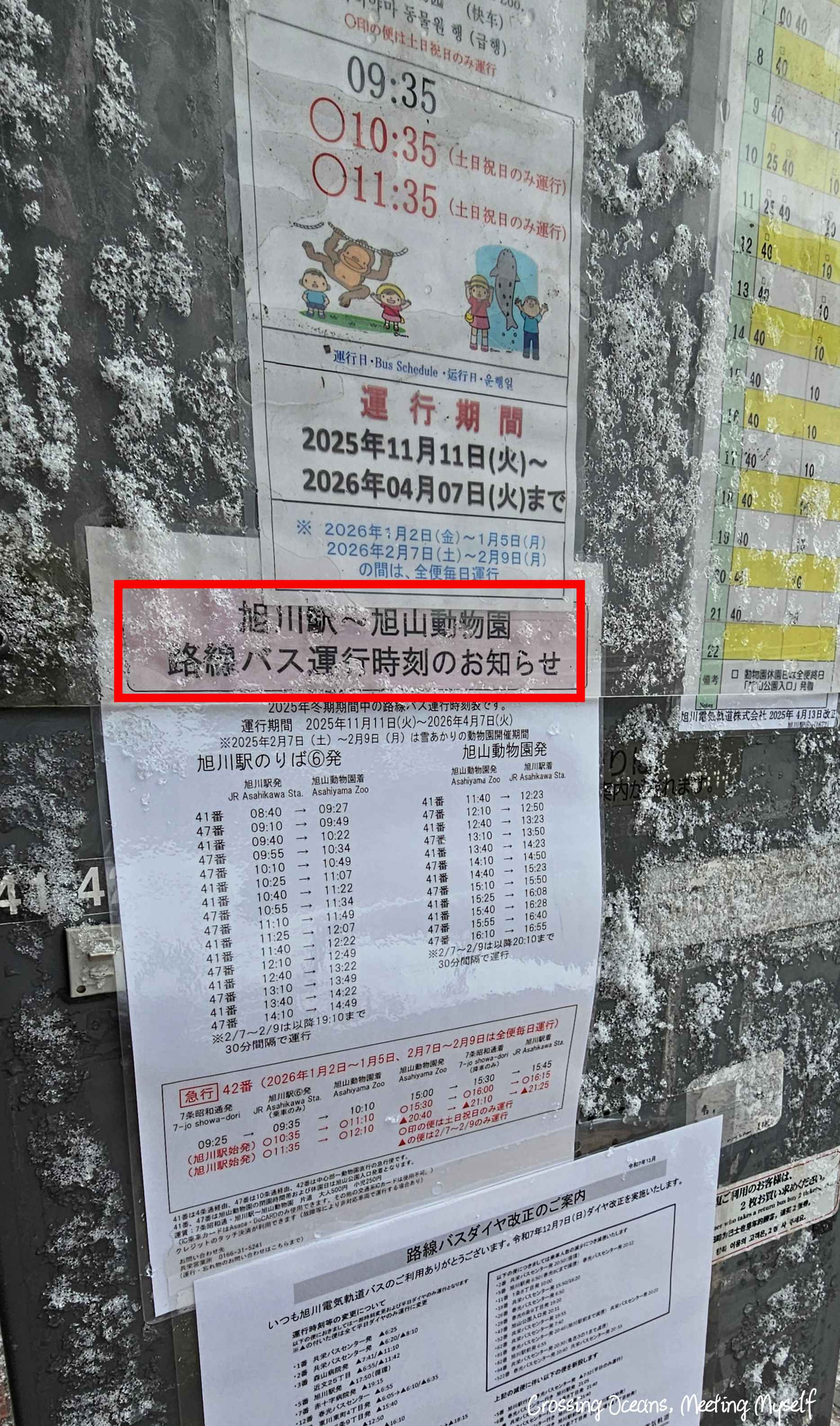 🔺我到12點才出飯店,走到飯店前的站牌,這還是我第一次看到…快結冰的站牌,要摸掉雪才能看清楚公車資訊😅。