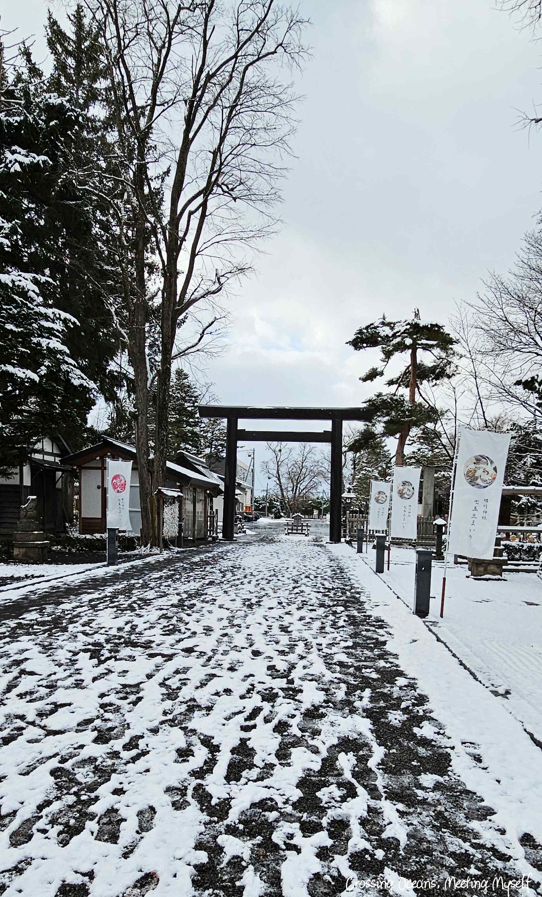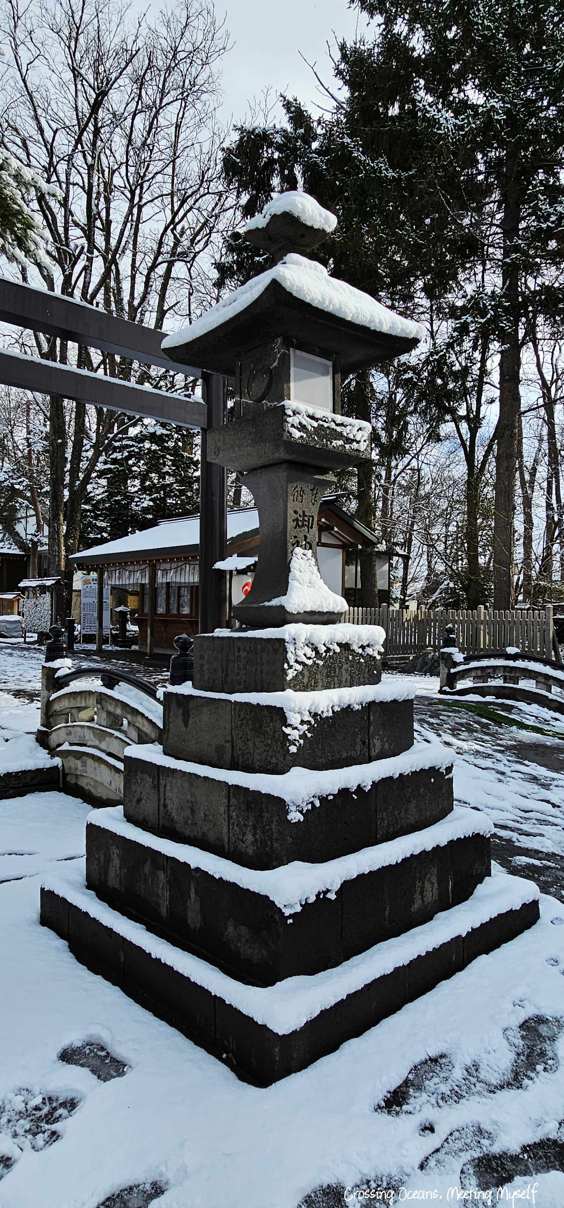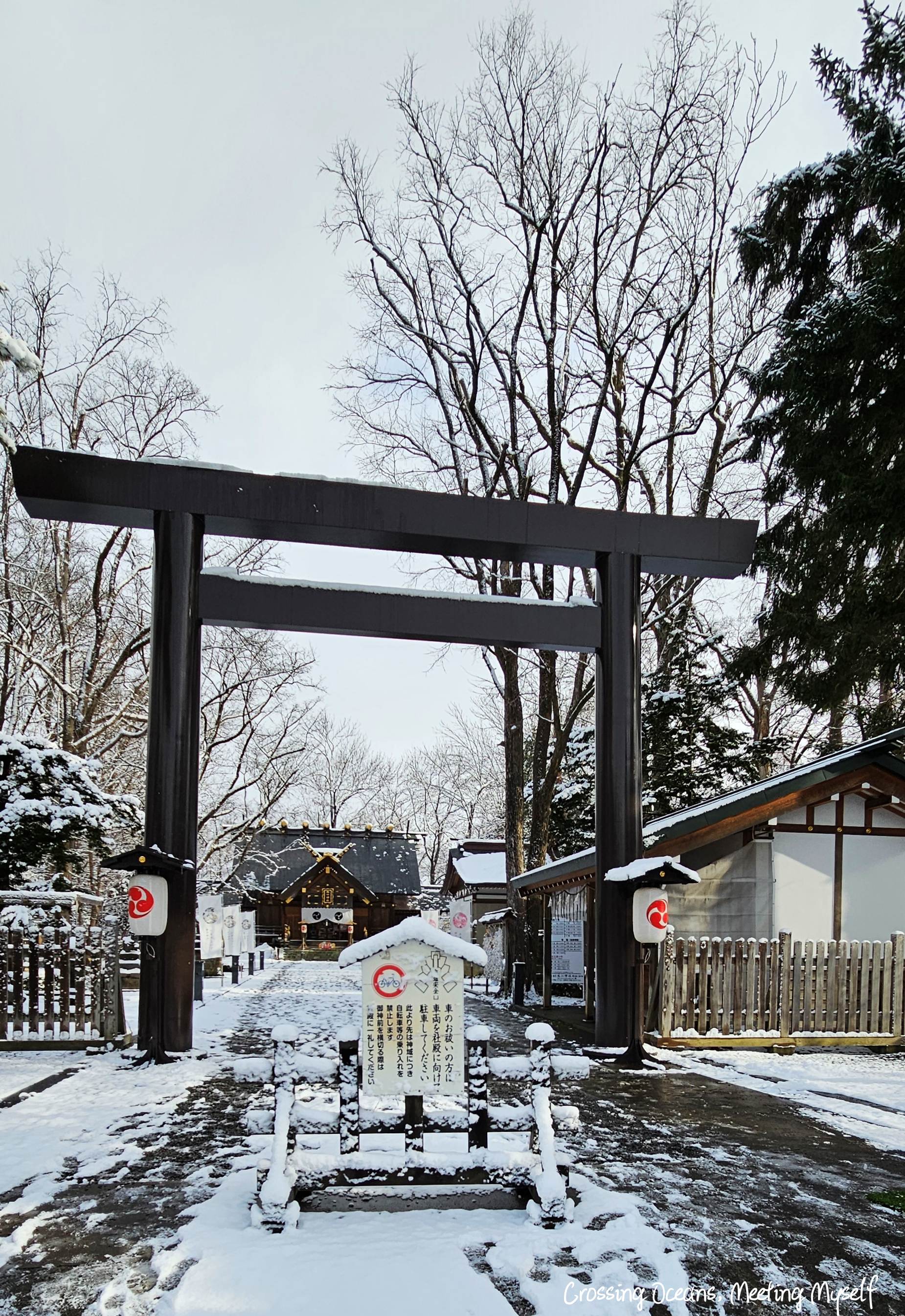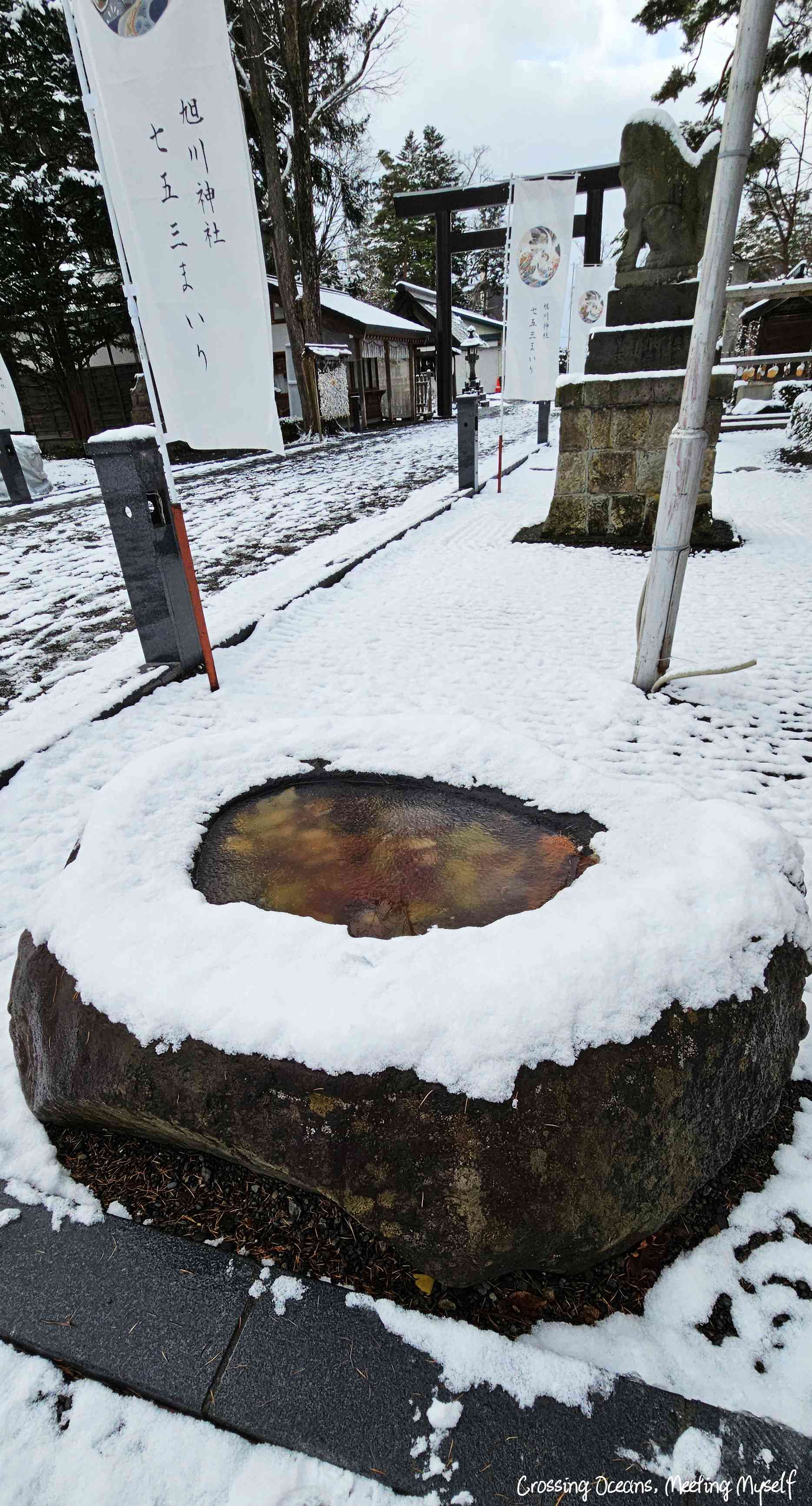 走到⛩️旭川神社⛩️們口,我望著巨大的鳥居,鳥居上的木頭此時正因為積雪重量,雪一大片一大片的落下來,好神奇阿…(這種想法真的好土ㄡ~沒辦法,亞熱帶的人生中很少看到雪)。
