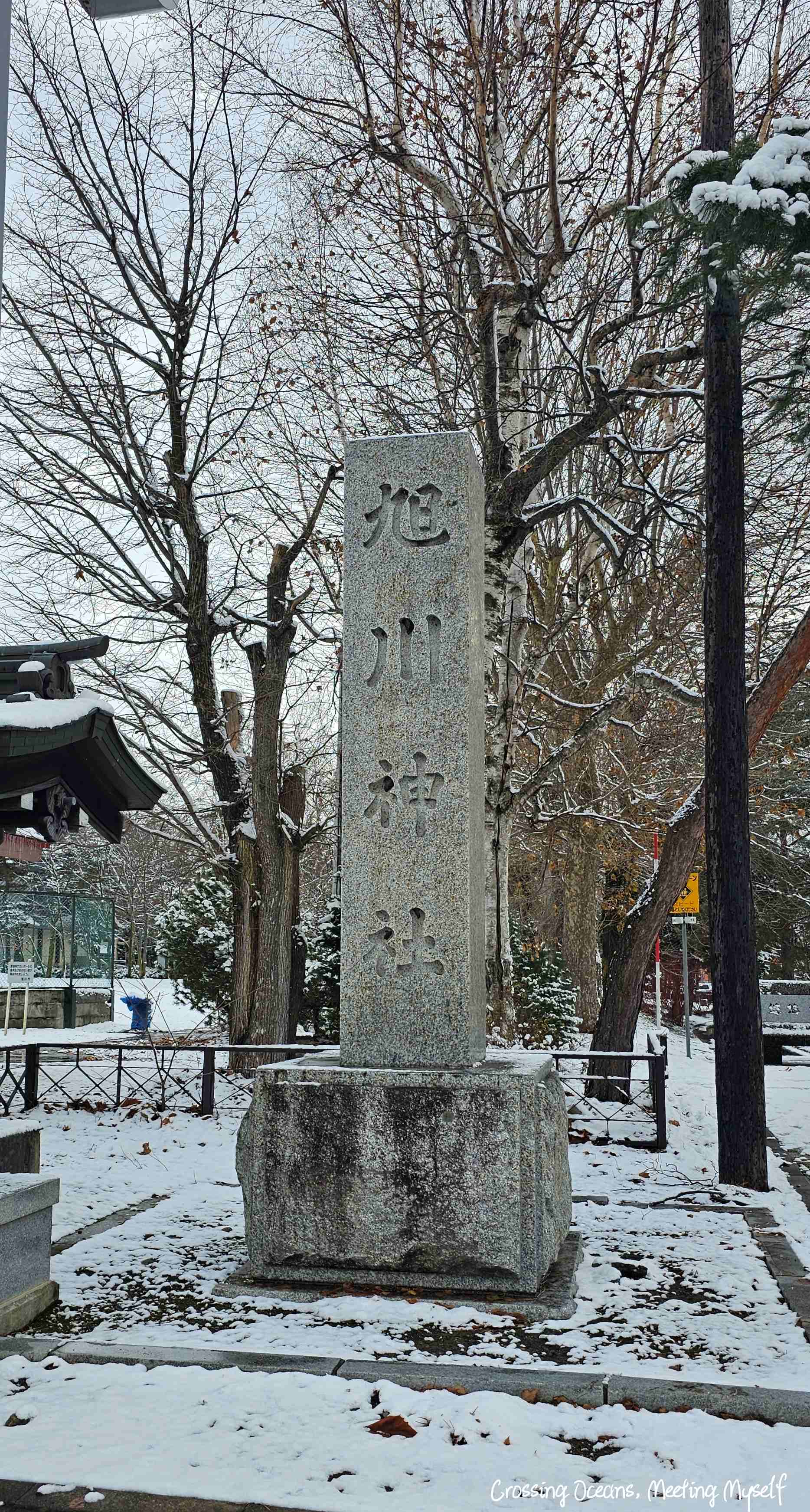 看到⛩️旭川神社⛩️碑文了,眼前是一片白雪,搞不清方向,我利用導航找到神社的方向。