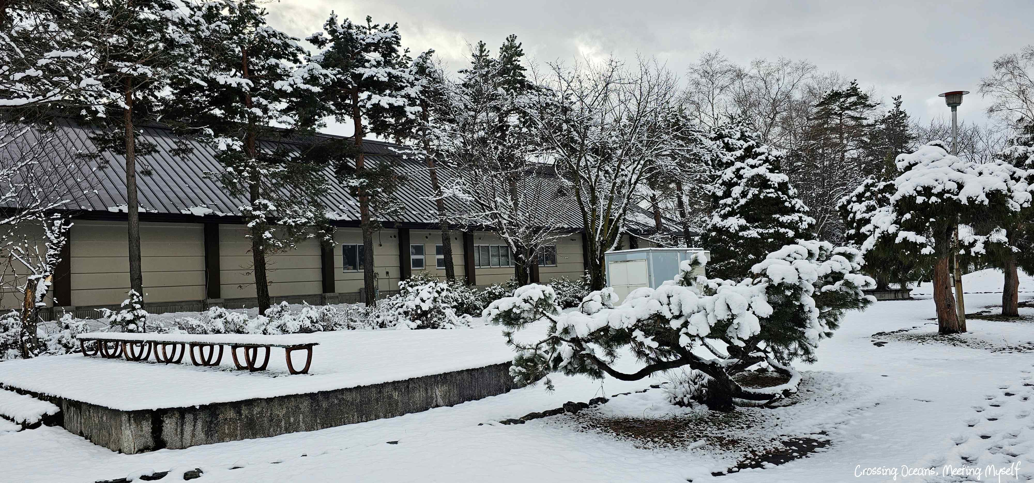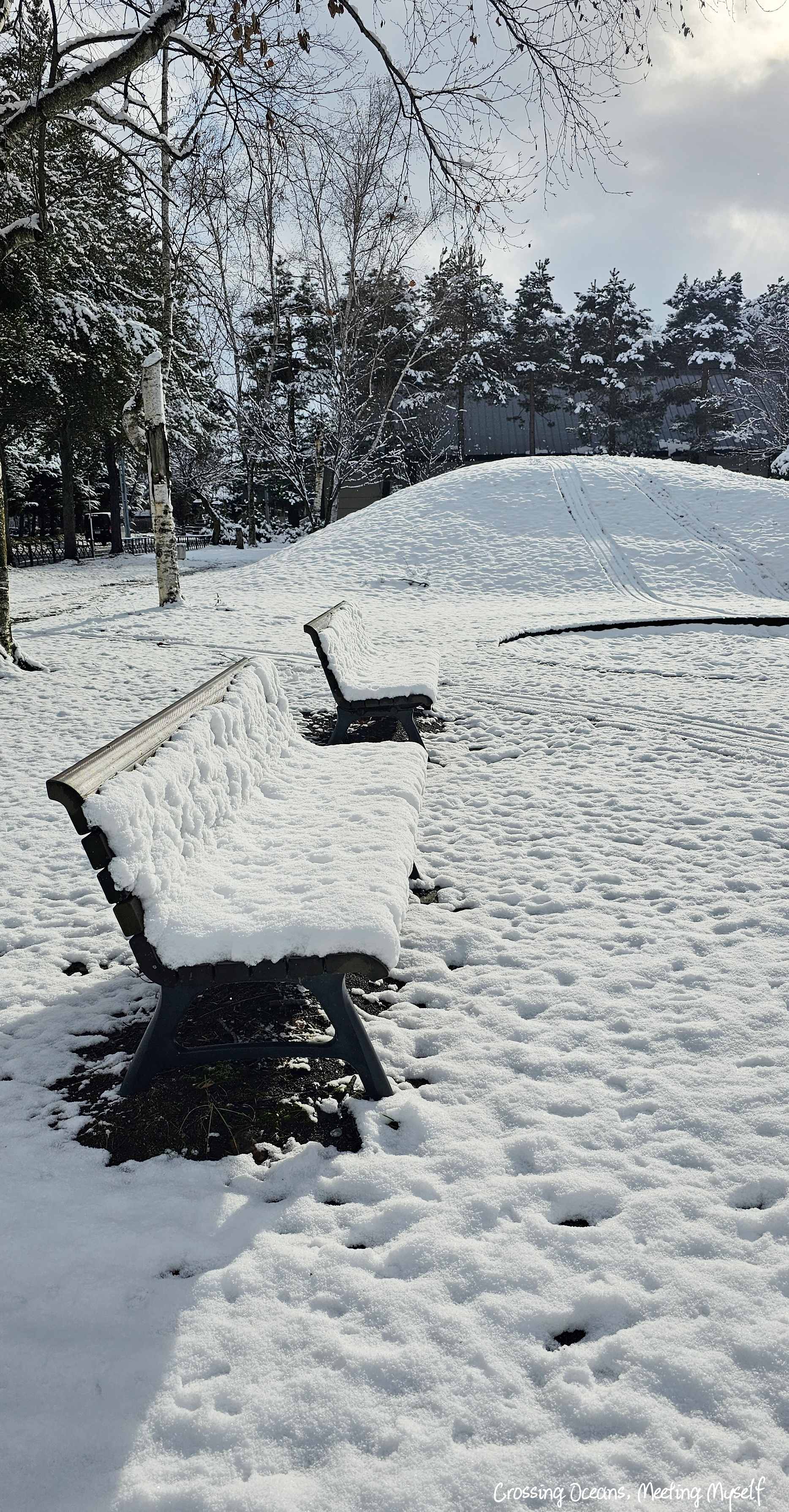 陽光下開始飄起雪,這裡是神社旁的東旭川屯田公園,公園的椅子被雪覆蓋著,沒想到昨晚的雪,這應該有1-2CM厚度吧,這對我來說都很特別,心想若坐下去肯定屁股全濕😂。