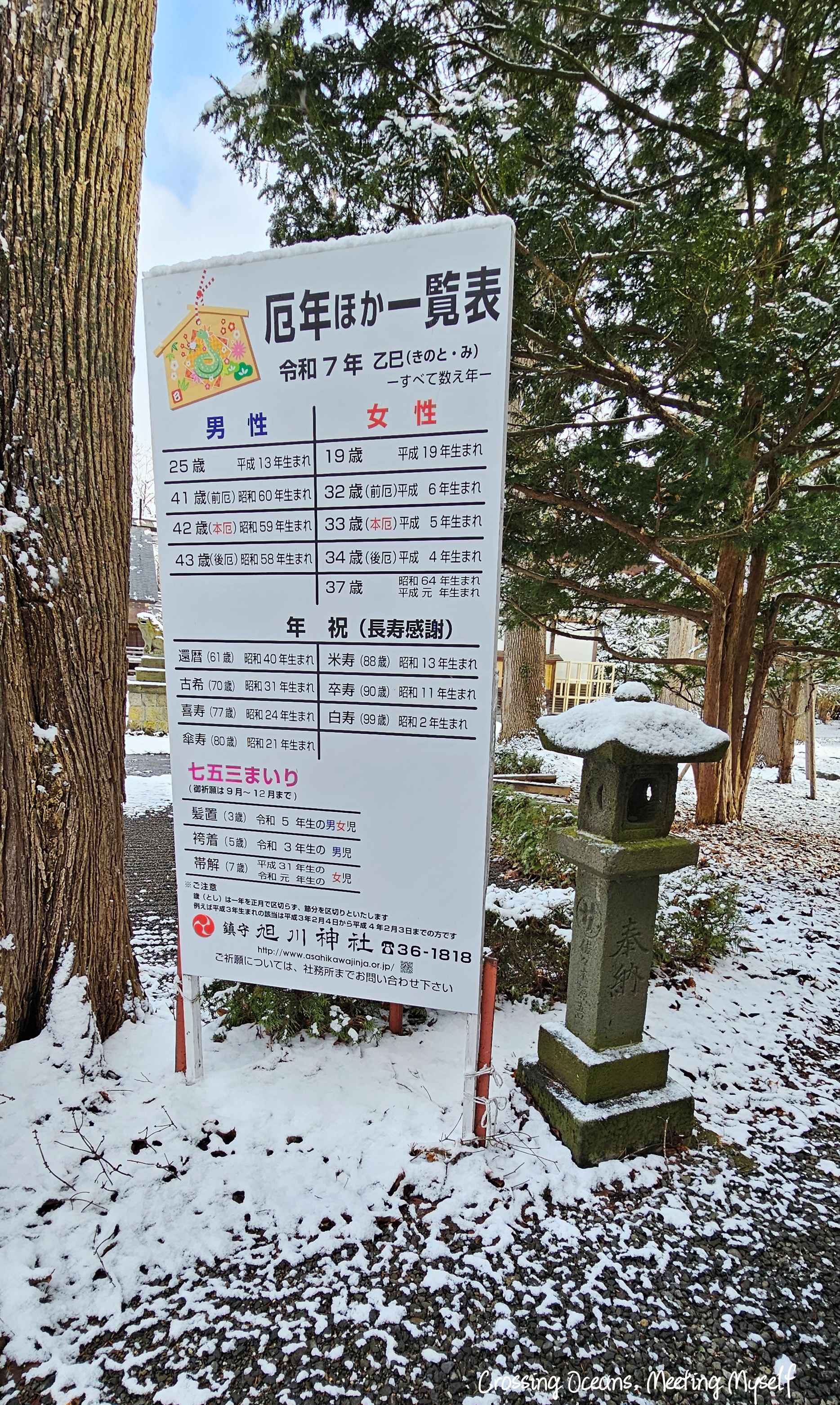神社門口貼著厄運年份一覽表,日本令和7年,西元2025年。這和台灣寺廟一樣,會告知今年份犯太歲的生肖☺️。