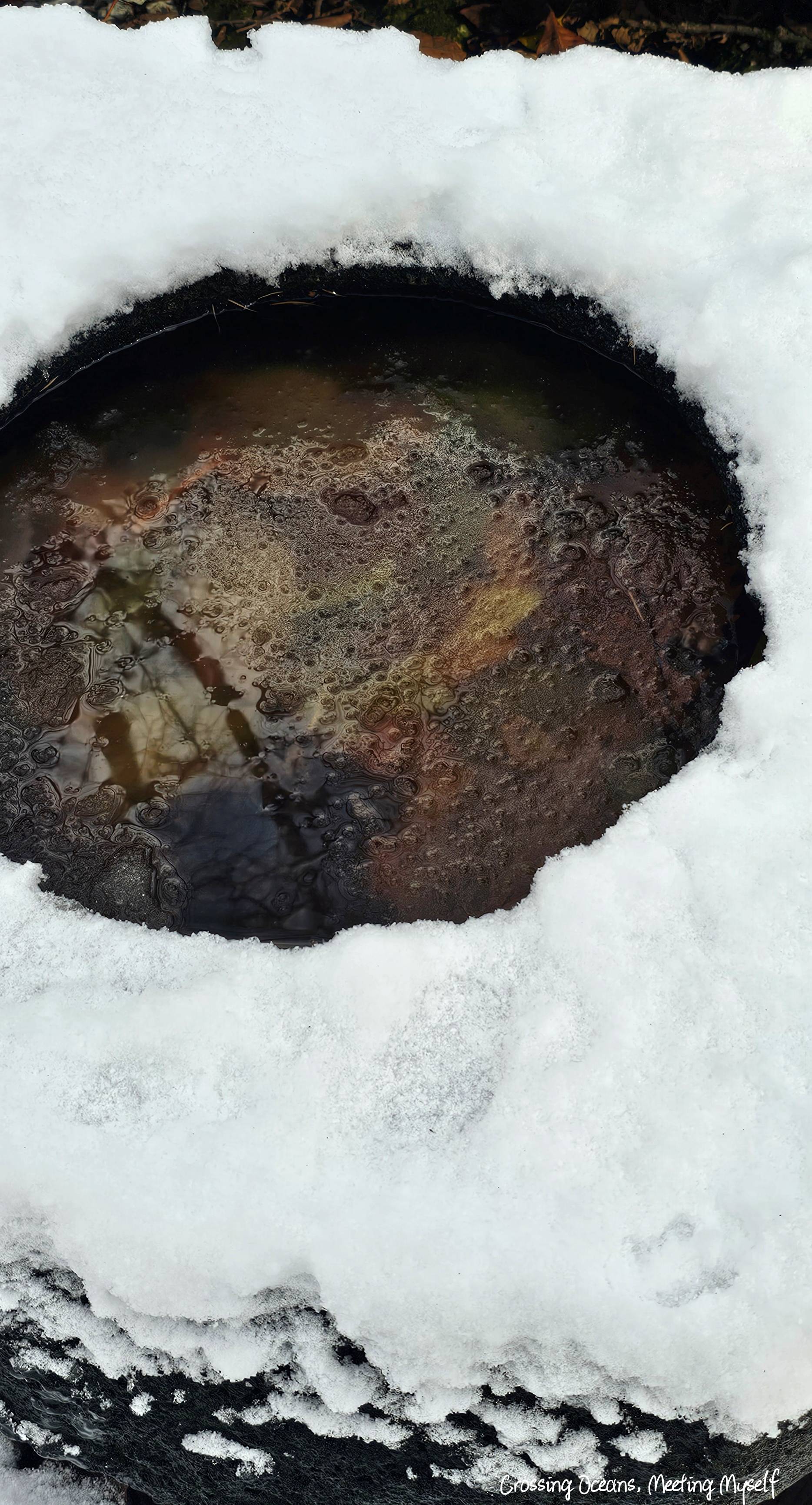 我好奇眼前的是甚麼? 是神社都有的手水舍嗎? 但感覺不像,還是手水鉢,我想這是水結冰了嗎?