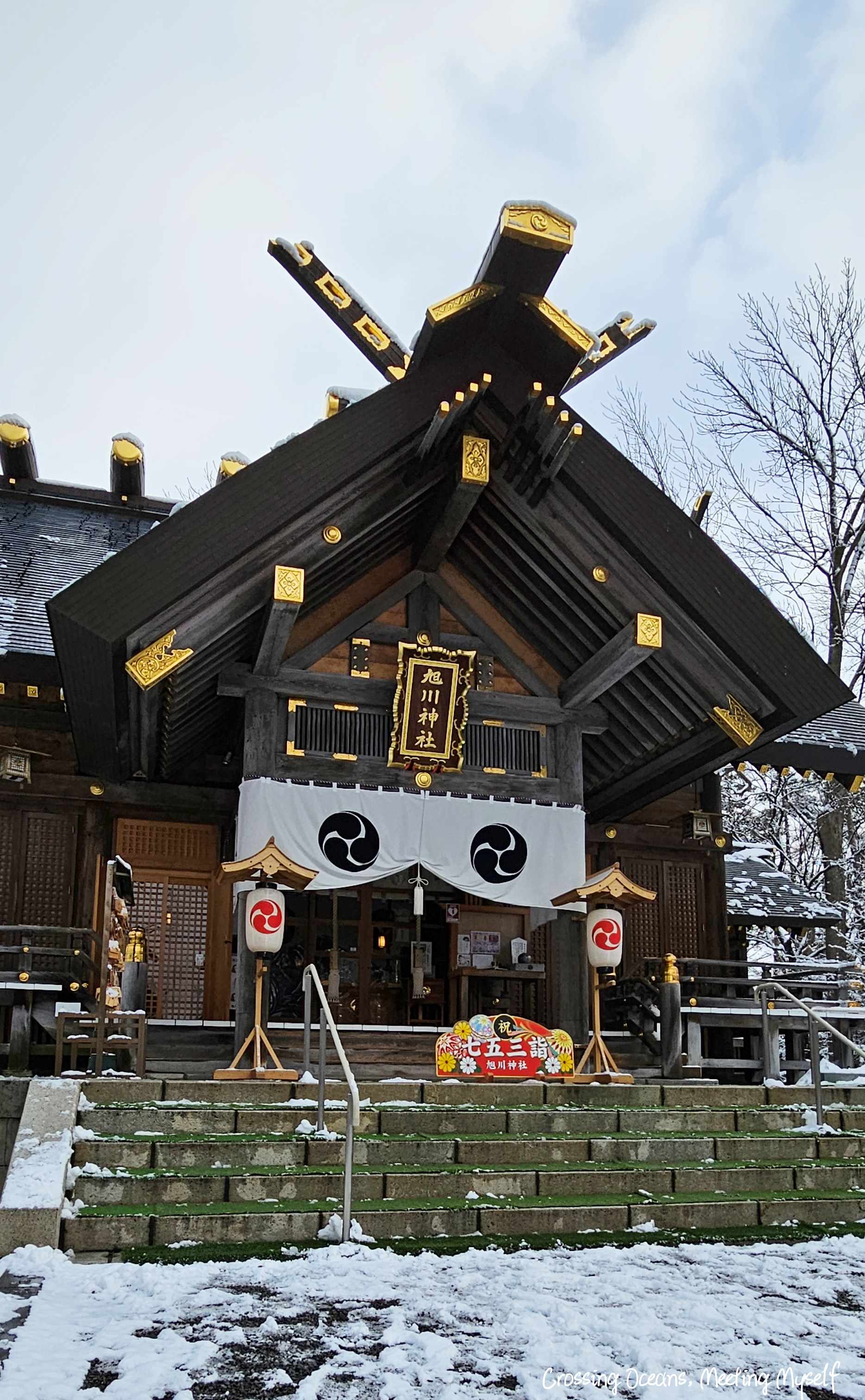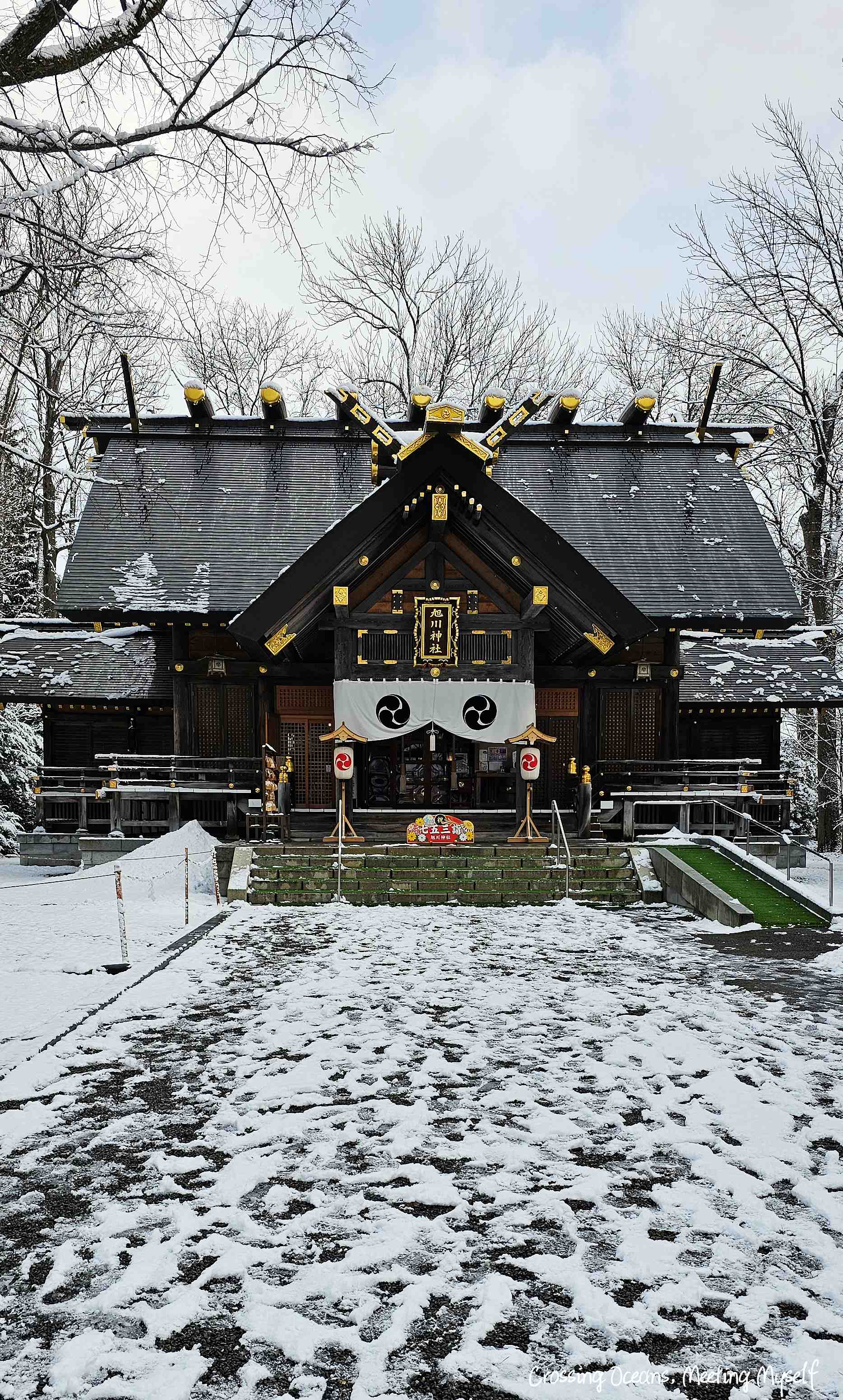 走著走著我已經來到旭川神社主殿,我這樣想著。以黑色為主的建築物搭配著金色字體,此時遊客很少,讓我覺得這裡特別莊神聖。