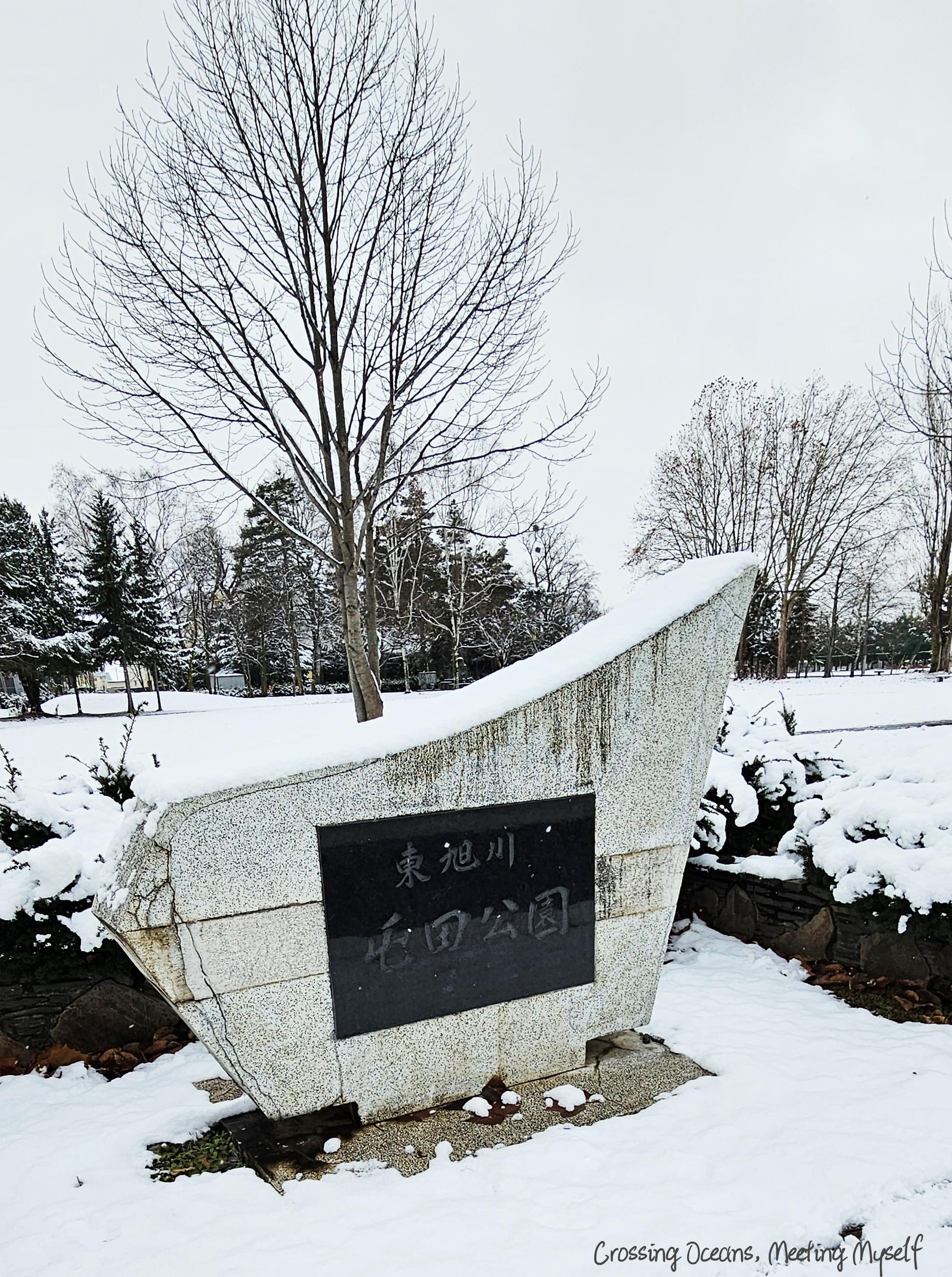 走過東旭川屯田公園,我看到被雪覆蓋著神社鳥居及鎮守旭川神社石碑,