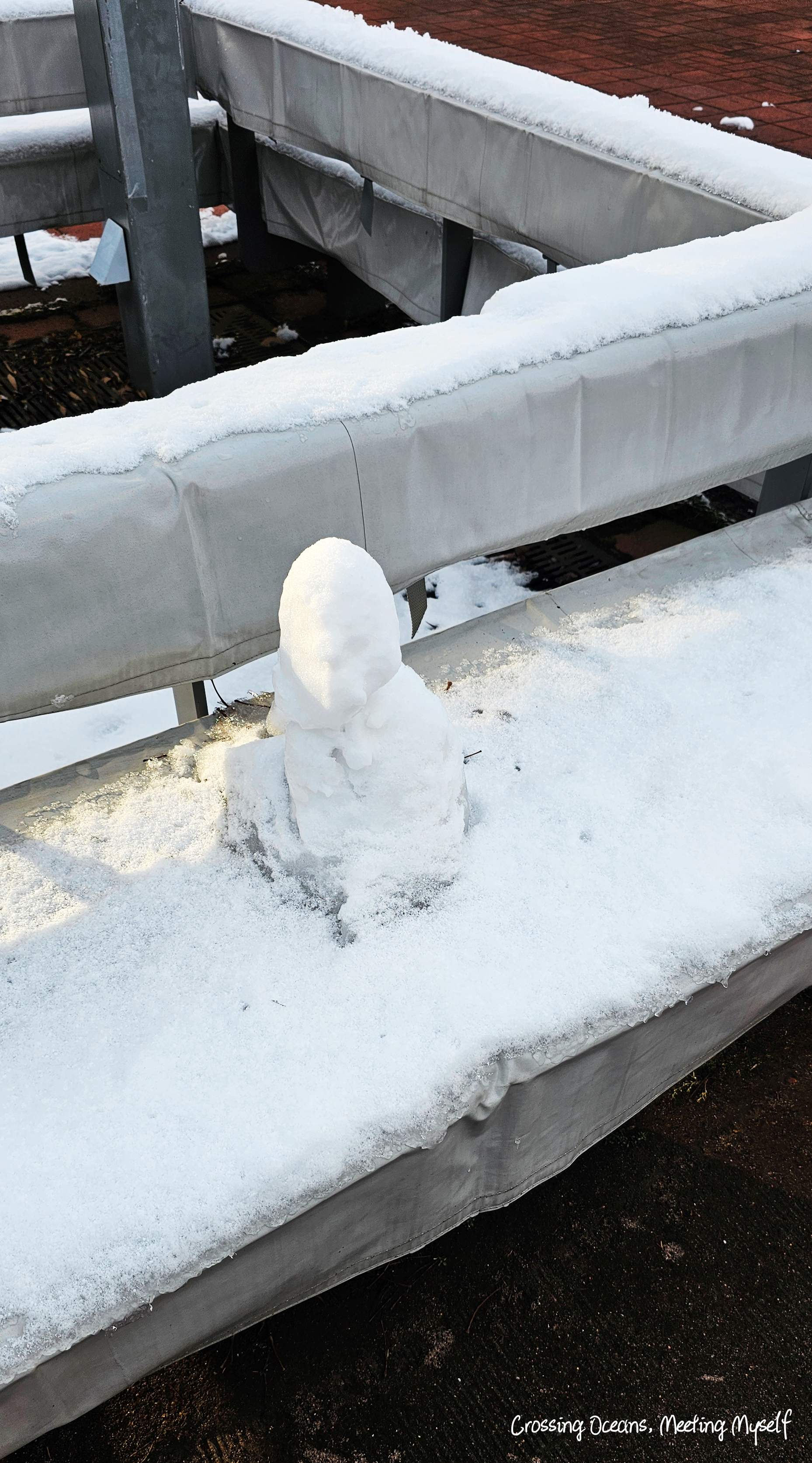 🔻 旭川車站前廣場椅子上,我看到有人堆了一個小雪人? 似乎已融化了變成了…猩猩😅?
