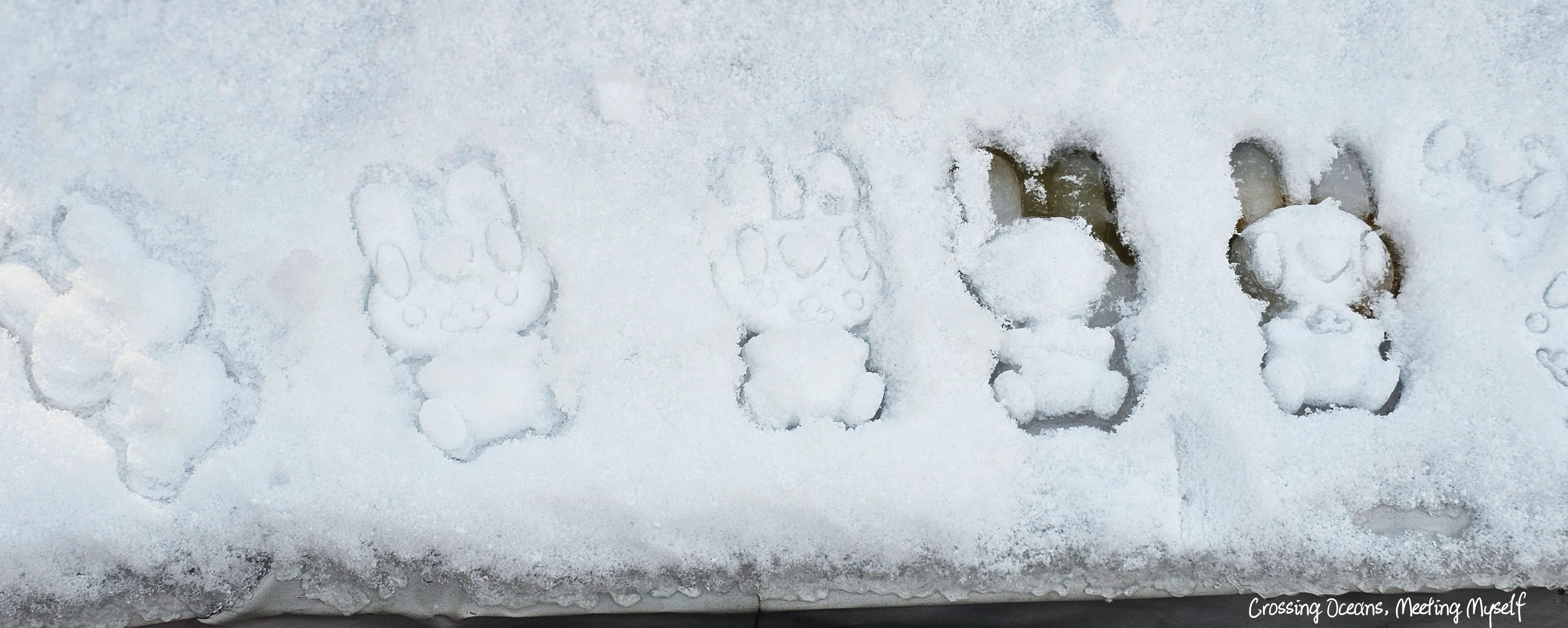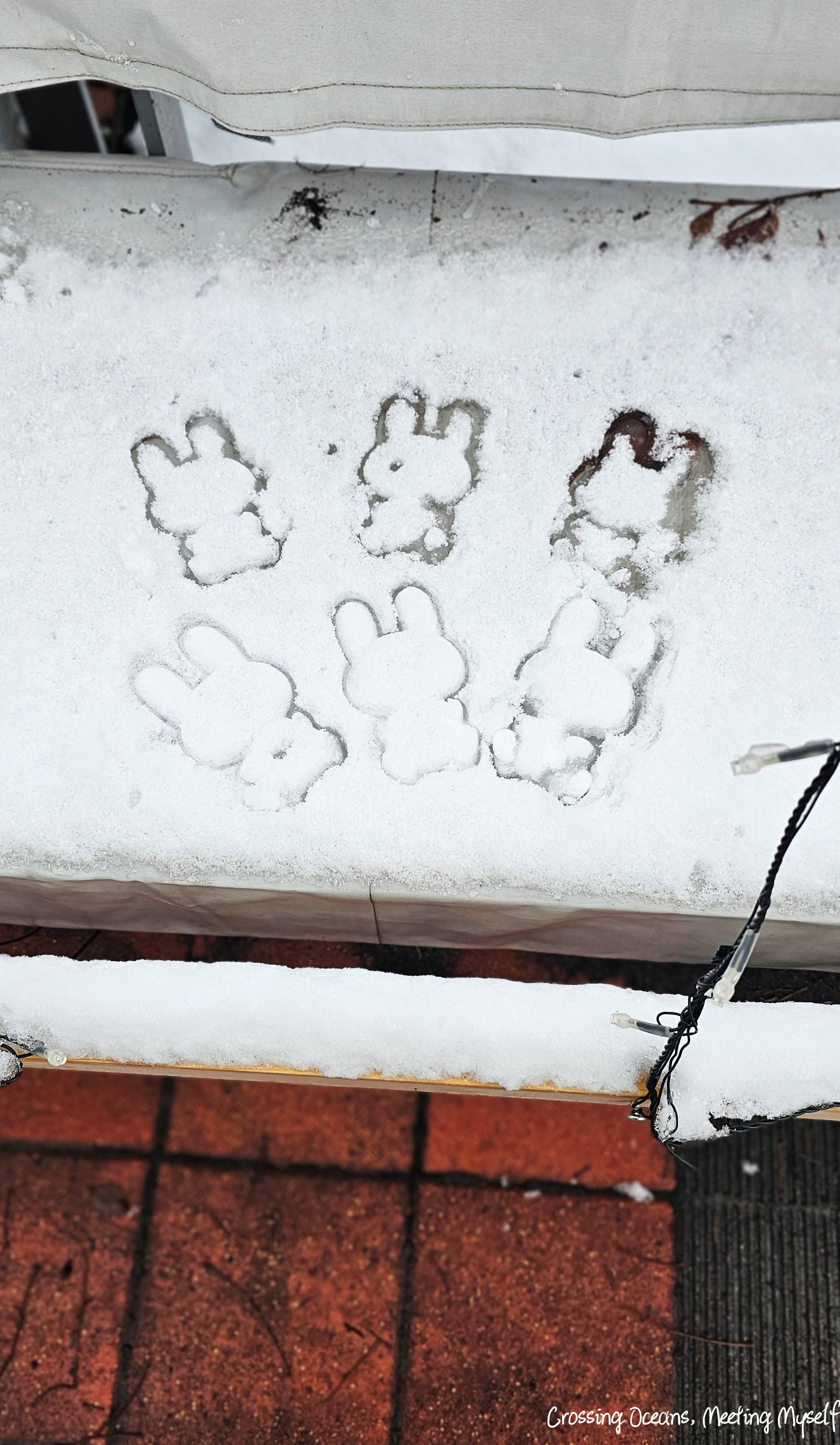 🔻 我也不顧來往的行人,拿出在南稚內大創買的模具開始在雪多的椅子上蓋上兔子的形狀😅🐰🐰。